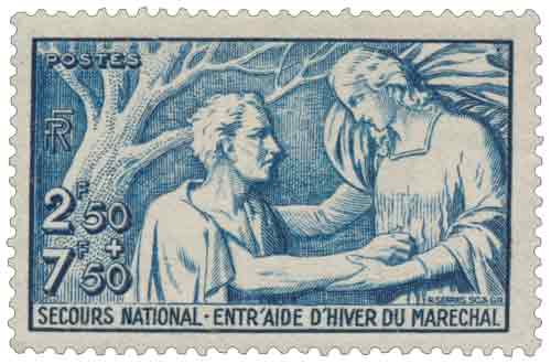 | Commentaire | Secours National - La France aide les pauvres entre aide d'hiver du Maréchal. Démonétisé le :01/11/1944 Le timbre Secours National - La France aide les pauvres, mis en vente générale le 4 mars 1941, est la valeur la plus élevée de la série de bienfaisance dite de l'Entr'aide d'hiver du Maréchal. L'œuvre, dessinée et gravée par Raoul Serres, met en scène une allégorie de la France protégeant et assistant les plus démunis, un motif central de la propagande sociale du régime de Vichy. Cette figurine présente une valeur faciale de 2,50 francs, destinée aux courriers lourds ou aux tarifs internationaux, augmentée d'une très forte surtaxe de 7,50 francs au profit du Secours National. Bien que le tirage initial ait été fixé à 1,22 million d'exemplaires, seul un volume d'environ 600 000 unités a été effectivement vendu avant le retrait de la vente le 17 août 1941. Imprimé en taille-douce rotative sur la presse n° 5, ce timbre de couleur bleu se présente en feuilles de 25 exemplaires (disposition par panneau de tirage). Son format horizontal de 36x21,45 mm et sa dentelure 13 en font une pièce imposante, dont les coins datés sont très recherchés par les collectionneurs pour attester de la période de fabrication sous l'Occupation. |
