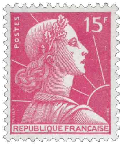 | Commentaire | En savoir plus avec ce site spécialisé sur la Marianne de Muller : http://muller.j257.fr/ Émis par la France en 1955, ce timbre-poste gommé de la série courante dite Marianne de Muller constitue l’une des valeurs fondamentales du dispositif postal de l’après-guerre, destinée à l’affranchissement de la lettre simple jusqu’à 20 grammes pour l’intérieur ; mis en vente le 22 février 1955, il adopte un petit format vertical imprimé en typographie rotative, technique encore largement utilisée pour les valeurs de très grand usage, et reprend l’effigie républicaine conçue par Louis Charles Muller, à la fois classique et épurée ; gravé par Jules Piel, le timbre est imprimé en rose carminé, couleur distinctive choisie pour identifier immédiatement la valeur de 15 francs, correspondant au tarif le plus courant du courrier intérieur à cette période ; cette figurine a connu une diffusion exceptionnelle, ayant été émise sous de multiples formes — feuilles, carnets et roulettes — afin de répondre à l’ampleur des besoins postaux, ce qui en fait l’un des timbres les plus utilisés de la série ; emblématique de la vie quotidienne des années 1950, la Marianne de Muller à 15 francs illustre la fonction première de la philatélie d’usage : assurer la circulation massive du courrier tout en maintenant la permanence symbolique de la République. |