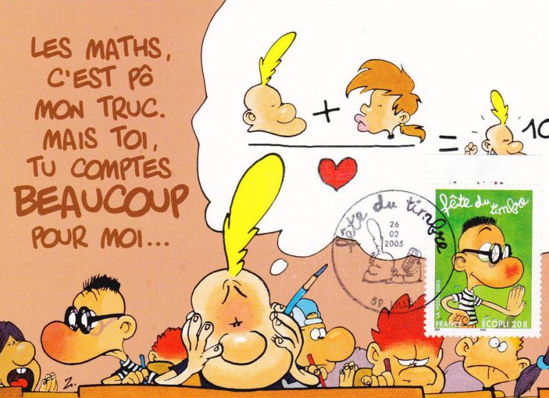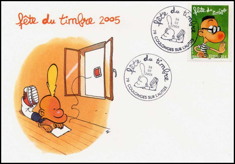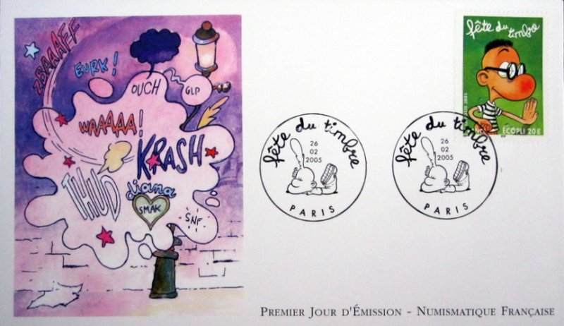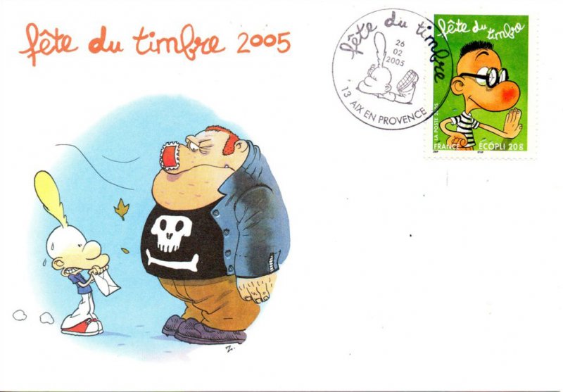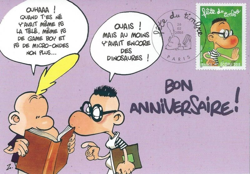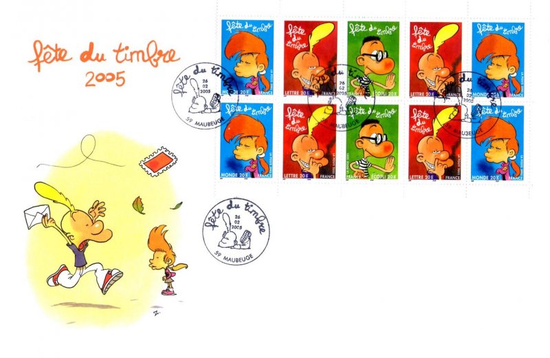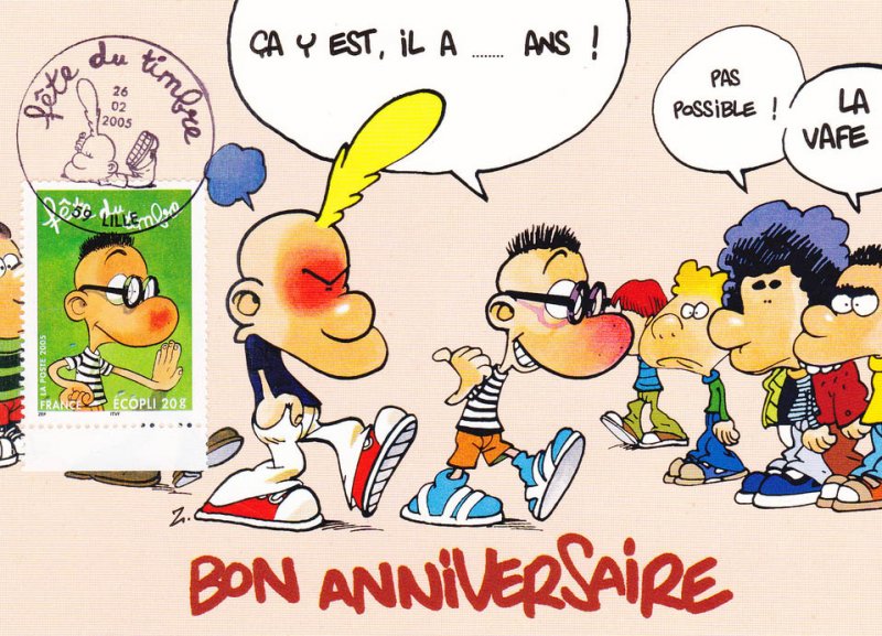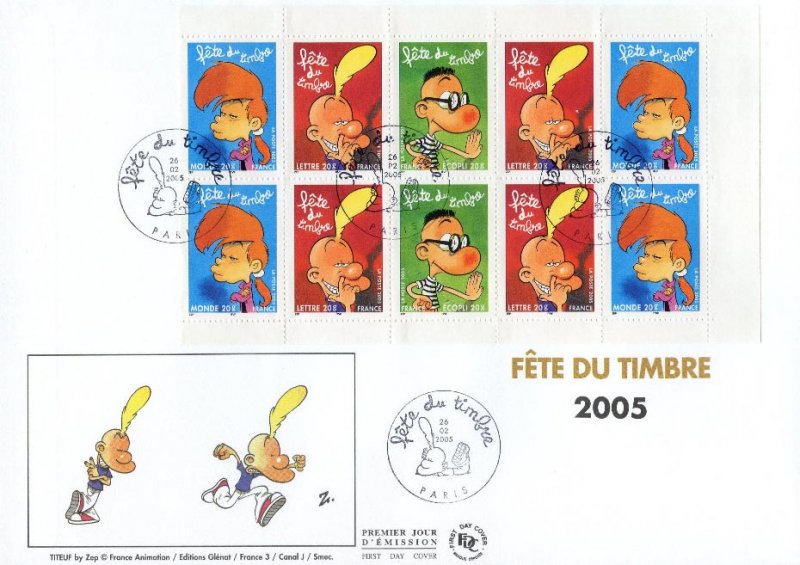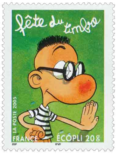 | Description | Fête du Timbre 2005. Bande dessinée. Manu, du dessinateur Zep. Émis en carnet. Sans valeur indiquée (validité permanente). Titeuf par Zep © France Animation/Éditions Glénat/France 3/Canal J/Smec. |