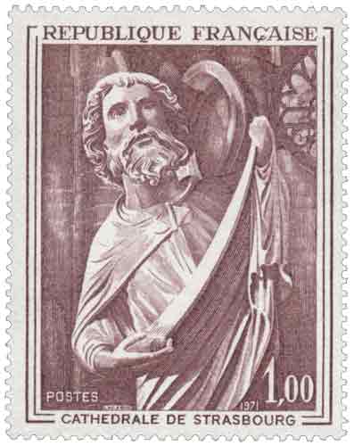 Ce timbre-poste français émis en 1971 appartient à la série du « Musée imaginaire », consacrée à la mise en valeur du patrimoine artistique par la philatélie, et reproduit la sculpture de saint Matthieu provenant de la cathédrale Notre-Dame de Strasbourg, œuvre majeure du premier tiers du XIIIᵉ siècle illustrant l’apogée de l’art gothique, conservée in situ sur le célèbre pilier des Anges de la cathédrale de Strasbourg ; imprimé en taille-douce rotative et destiné à l’affranchissement complémentaire du courrier intérieur, ce timbre vertical de 1,00 F met en lumière la transition stylistique entre l’héritage roman et l’affirmation du volume et du mouvement propres à la sculpture gothique, caractérisée par la fusion étroite de l’architecture et de la statuaire, démarche influencée par les grands chantiers de Chartres et perceptible dans l’expressivité du drapé, la vigueur du modelé et la présence presque humaine de l’évangéliste, choisi ici comme symbole du programme iconographique de la Rédemption développé à Strasbourg après l’incendie de 1176 ; l’existence d’une réplique ancienne au musée des Monuments français constitue une anecdote historiquement attestée soulignant l’importance reconnue de cette figure dans l’histoire de la sculpture médiévale. |