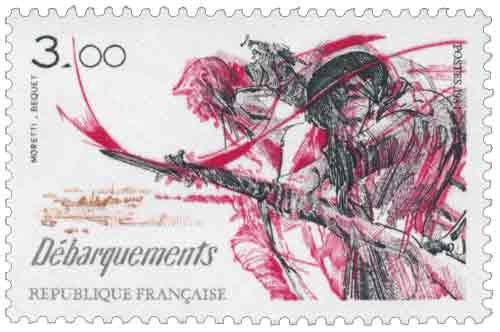 | Commentaire | Ce timbre est émis en 1984 à l’occasion du 40e anniversaire de la Libération et se concentre sur les débarquements alliés de 1944, événements décisifs dans la reconquête du territoire français. Il appartient à un ensemble commémoratif présenté sous la forme d’un triptyque indivisible associant deux timbres et une vignette centrale sans valeur postale, choix qui traduit la volonté de rappeler la complémentarité entre l’action militaire extérieure et la lutte menée sur le sol national. Le sujet renvoie directement aux opérations du 6 juin 1944 en Normandie, précédées dans la nuit par les largages aéroportés et suivies, dès l’aube, par l’assaut des plages sous un déploiement naval et aérien sans précédent. Ce timbre évoque également la progression rapide des forces alliées, rendue possible par l’implantation de têtes de pont solides et par l’action concomitante des réseaux de résistance, qui désorganisent les communications ennemies et entravent l’acheminement des renforts allemands. La libération progressive des villes normandes, puis l’entrée des forces françaises et alliées dans Paris à la fin de l’été 1944, s’inscrivent dans cette dynamique ouverte par les débarquements. Dans la politique postale française, cette émission s’intègre à une série de commémorations décennales destinées à transmettre la mémoire de la Seconde Guerre mondiale, en mettant en avant les grandes étapes militaires et humaines qui ont conduit à la libération du pays. Ce timbre rappelle ainsi le rôle fondamental des opérations amphibies et aéroportées dans l’histoire contemporaine de la France et dans la construction de la mémoire nationale liée à 1944. Article rédigé pour WikiTimbres |