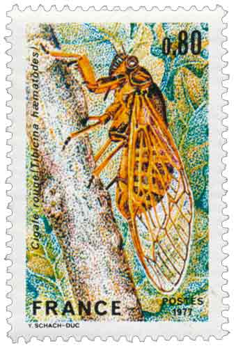 | Commentaire | Ce timbre s’inscrit dans la série consacrée à la faune française et illustre l’intérêt porté dans les années 1970 à la vulgarisation scientifique par l’image postale, en particulier autour du monde naturel et de sa diversité. Le sujet retenu, la cigale rouge Tibicina haematodes, témoigne d’une volonté pédagogique affirmée : représenter un insecte emblématique du Midi tout en dépassant l’image folklorique souvent associée aux cigales. Ce timbre met en lumière le vaste groupe des arthropodes et, plus largement, cette « nature à six, huit et mille pattes » longtemps ignorée ou mal comprise du grand public. À travers cette émission, la Poste française accompagne un mouvement de sensibilisation à la biodiversité, en soulignant la complexité biologique et les cycles de vie parfois spectaculaires des insectes. La cigale rouge, par sa double existence — une phase larvaire souterraine de plusieurs années suivie d’une vie adulte brève, sonore et aérienne — illustre parfaitement cette richesse du vivant. Répandue en Europe tempérée, notamment dans la vallée du Rhône et le sud de la France, elle incarne un lien fort entre paysage, climat et faune locale. Le choix graphique, fondé sur des couleurs contrastées et une restitution précise des nervures alaires, renforce la dimension scientifique de ce timbre tout en restant accessible au regard non spécialiste. Utilisé pour l’affranchissement des plis non urgents, ce timbre participe pleinement à la diffusion quotidienne d’un message culturel et éducatif, caractéristique de la politique philatélique française de la fin du XXᵉ siècle. Article rédigé pour WikiTimbres |