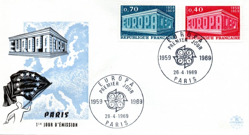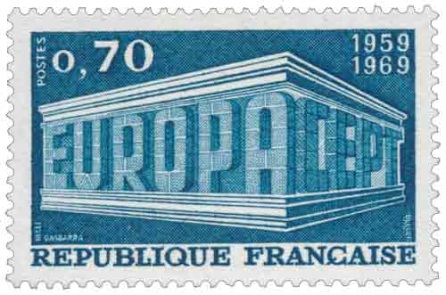 | Commentaire | Le timbre EUROPA C.E.P.T. émis en 1969 dans sa valeur à 0,70 franc s’inscrit dans l’émission annuelle européenne destinée à symboliser, par l’image postale, la coopération croissante entre les administrations des Postes et Télécommunications du continent, et commémore plus précisément le dixième anniversaire de la Conférence Européenne des Postes et des Télécommunications, créée à la fin des années 1950 pour accompagner l’élargissement de cette collaboration au-delà des seuls pays de la Communauté Économique Européenne ; pour la première fois dans l’histoire des émissions EUROPA, l’ensemble des pays participants adopte un motif strictement commun, conçu par deux artistes italiens, figurant une architecture monumentale évoquant un temple antique dont les colonnes sont formées par les mots « EUROPA » et « CEPT », image volontairement stable et solennelle destinée à exprimer la cohésion, la solidité et la permanence d’une Europe construite par des échanges techniques, économiques et culturels ; en France, cette valeur faciale plus élevée, destinée notamment à l’affranchissement international, participe à la large diffusion du message européen et illustre la fonction du timbre-poste comme support discret mais efficace de la politique commémorative et institutionnelle de l’État à la fin des années 1960. Article rédigé pour WikiTimbres |