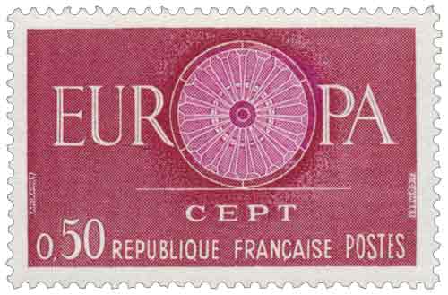 | Commentaire | Émis en septembre 1960, le timbre français EUROPA C.E.P.T. 0,50 F rouge s’inscrit dans la première émission commune organisée sous l’égide de la Conférence européenne des administrations des postes et des télécommunications, marquant une étape décisive dans l’histoire des timbres « Europa ». Alors que, depuis 1956, ces émissions restaient limitées aux six pays fondateurs de la Communauté économique européenne, l’édition de 1960 élargit considérablement le périmètre en réunissant dix-neuf administrations postales européennes autour d’un même symbole. Le motif retenu, œuvre de l’artiste finlandais Pentti Rahikainen, représente une roue à dix-neuf rayons évoquant à la fois l’héritage européen antique et la solidarité technique moderne entre les pays membres de la CEPT, chacun des rayons figurant une administration participante. Cette figurine de 0,50 franc, imprimée en taille-douce, correspond à un usage postal courant pour l’affranchissement des lettres à destination de l’étranger, illustrant la vocation internationale de cette coopération. Par son graphisme épuré et sa diffusion importante, ce timbre incarne l’ambition d’une Europe des communications fondée sur la concertation et l’efficacité, bien avant l’harmonisation politique plus poussée du continent. Article rédigé pour WikiTimbres. |