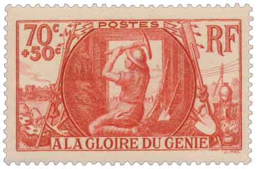 | Commentaire | A la gloire du Génie. Émis le 4 avril 1939 en taille-douce rotative sur feuilles de 25 exemplaires, à 1 200 000 exemplaires, ce timbre semi-postal horizontal en rouge, dentelé 13 et de valeur faciale 70 c + 50 c, correspondait au tarif des papiers d'affaires jusqu'à 20 grammes tandis que la surtaxe bénéficiait aux œuvres de l'Armée. Dessiné et gravé par Jules Piel, il représente des soldats du génie creusant un tunnel, exaltant le rôle technique et logistique de cette arme spécialisée dans les infrastructures militaires, dans un contexte de remilitarisation française à la veille de la Seconde Guerre mondiale où le génie apparaissait essentiel à la mobilité et à la défense nationale. |