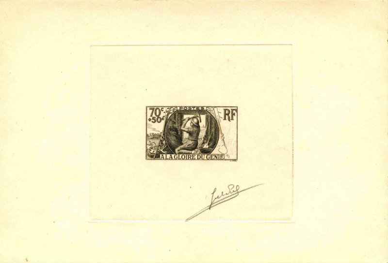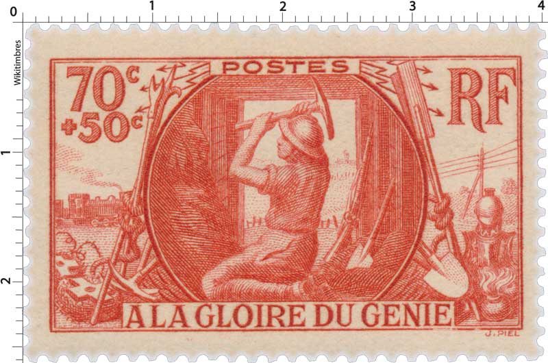 | Commentaire | A la gloire du Génie. Émis le 4 avril 1939 en taille-douce rotative sur feuilles de 25 exemplaires, à 1 200 000 exemplaires, ce timbre semi-postal horizontal en rouge, dentelé 13 et de valeur faciale 70 c + 50 c, correspondait au tarif des papiers d'affaires jusqu'à 20 grammes tandis que la surtaxe bénéficiait aux œuvres de l'Armée. Dessiné et gravé par Jules Piel, il représente des soldats du génie creusant un tunnel, exaltant le rôle technique et logistique de cette arme spécialisée dans les infrastructures militaires, dans un contexte de remilitarisation française à la veille de la Seconde Guerre mondiale où le génie apparaissait essentiel à la mobilité et à la défense nationale. |
