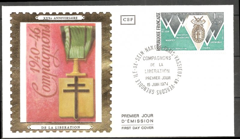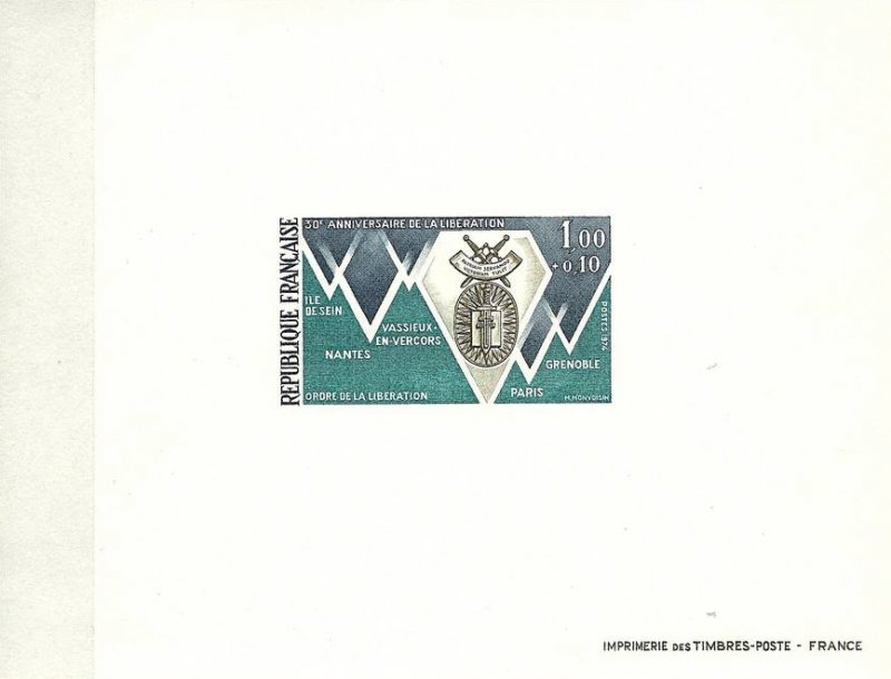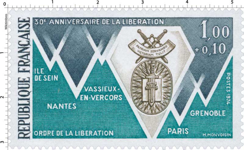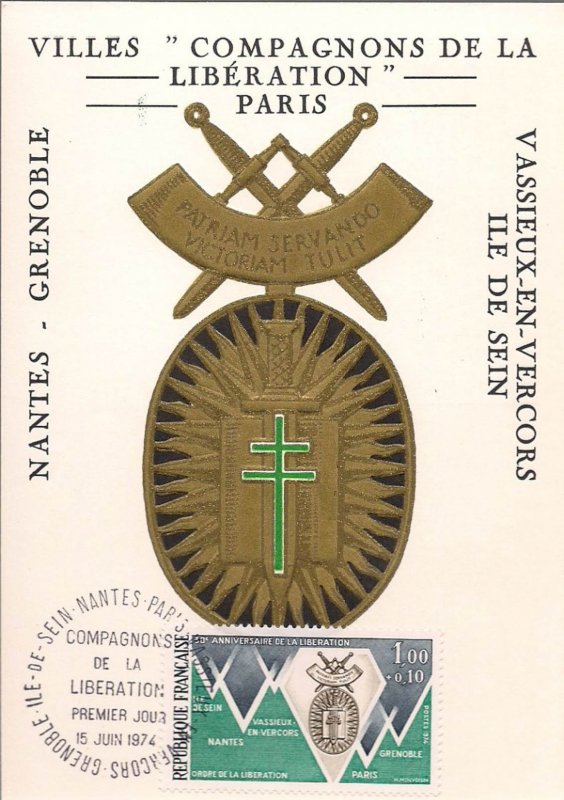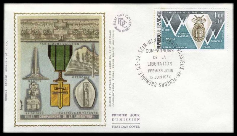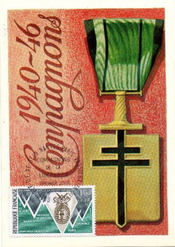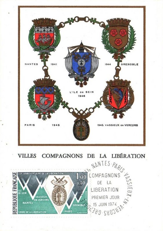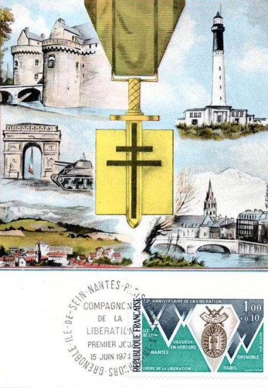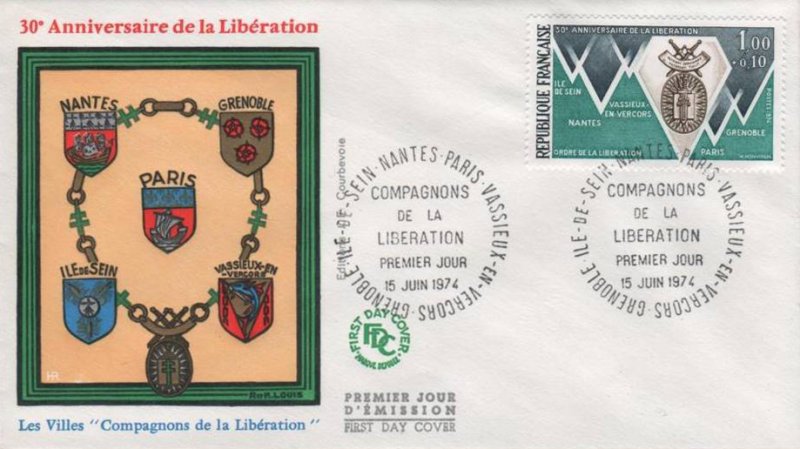 | Description | 30e anniversaire de la Libération, ordre de la Libération et villes «Compagnons de la Libération»: Grenoble, Île Sein, Nantes, Paris et Vassieux en Vercors |