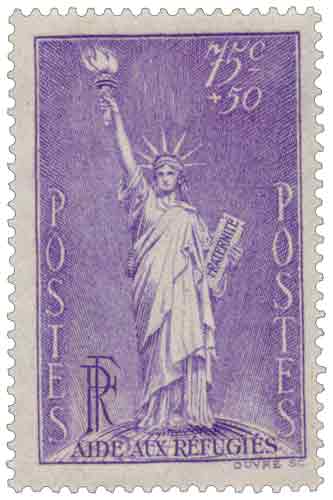 La Liberté éclairant le monde (Liberty Enlightening The World), plus connue sous le nom de Statue de la Liberté (Statue Of Liberty), est l'un des monuments les plus célèbres des États-Unis. Cette statue monumentale est située à New York, sur l'île de Liberty Island au sud de Manhattan, à l'embouchure de l'Hudson et à proximité d' Ellis Island. Cette émission caritative de 1936 s’inscrit dans la politique d’aide aux réfugiés mise en place au milieu des années 1930, alors que l’Europe connaît une forte instabilité politique. Le choix de la Statue de la Liberté, inspirée de l’œuvre de Frédéric-Auguste Bartholdi, n’est pas anodin : symbole universel d’accueil et de protection, elle sert parfaitement la thématique de solidarité envers les populations déplacées.