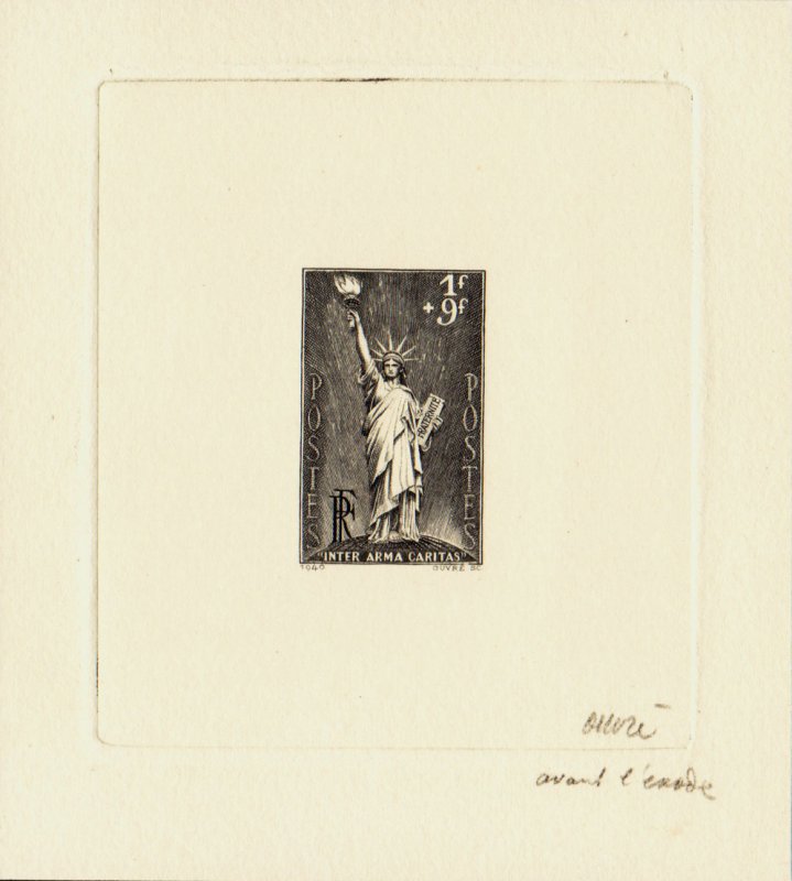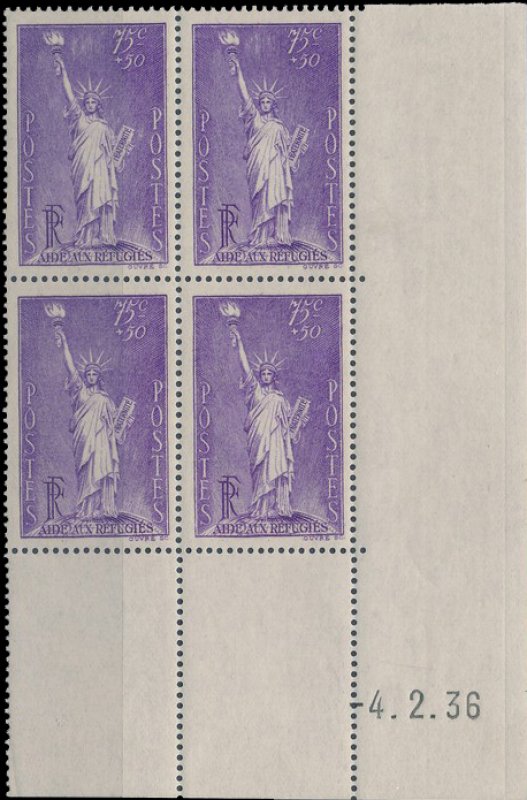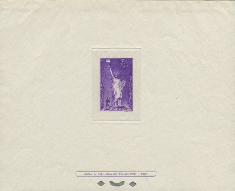 La Liberté éclairant le monde (Liberty Enlightening The World), plus connue sous le nom de Statue de la Liberté (Statue Of Liberty), est l'un des monuments les plus célèbres des États-Unis. Cette statue monumentale est située à New York, sur l'île de Liberty Island au sud de Manhattan, à l'embouchure de l'Hudson et à proximité d' Ellis Island. Cette émission caritative de 1936 s’inscrit dans la politique d’aide aux réfugiés mise en place au milieu des années 1930, alors que l’Europe connaît une forte instabilité politique. Le choix de la Statue de la Liberté, inspirée de l’œuvre de Frédéric-Auguste Bartholdi, n’est pas anodin : symbole universel d’accueil et de protection, elle sert parfaitement la thématique de solidarité envers les populations déplacées.