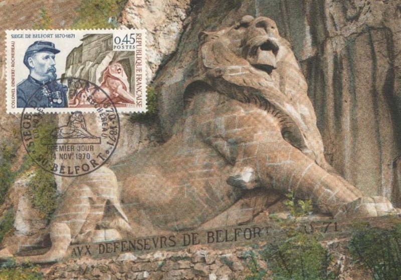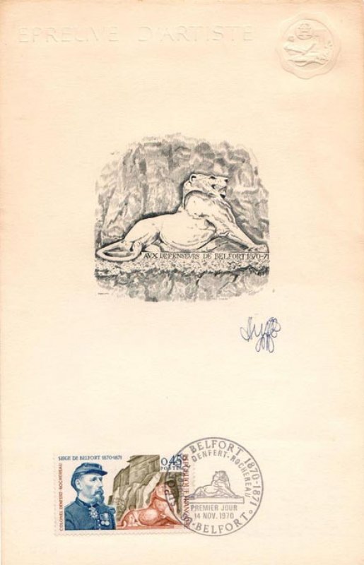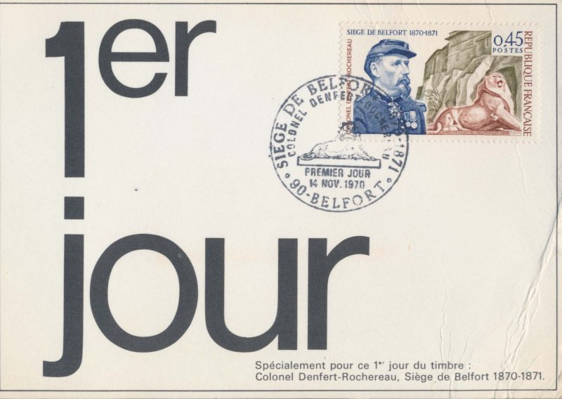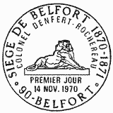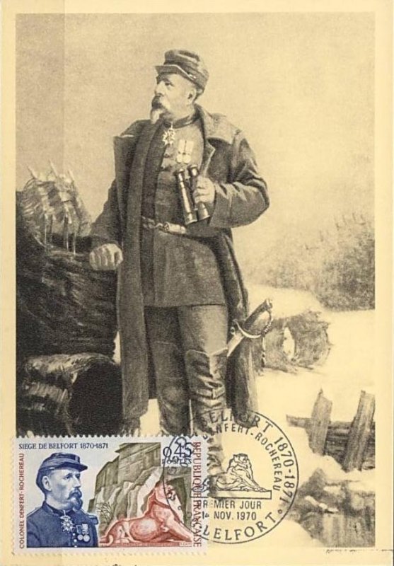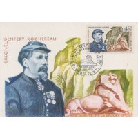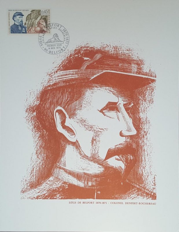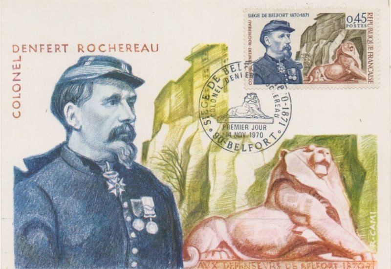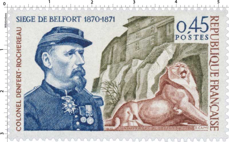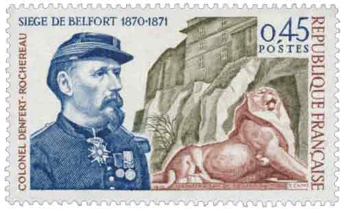 | Commentaire | Visuel : le Colonel Aristide Denfert-Rochereau, né le 11 janv.1823 à Saint-Maixent-l'École. (79-Deux-Sèvres), décédé le 11 mai 1878 à Versailles. (78-Yvelines), défenseur, avec ses soldats et l'aide de la population, de la place fortifiée de Belfort, surnommé le "Lion de Belfort", durant la guerre franco-prussienne de 1870. + le Lion en haut-relief, dans la falaise de la citadelle. |