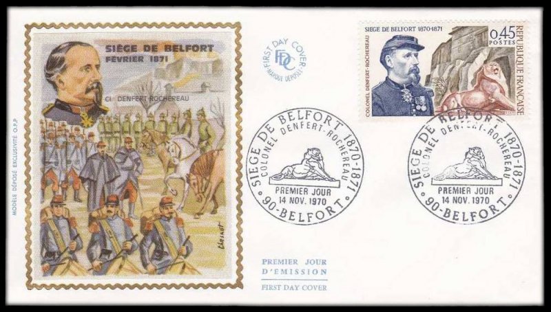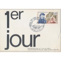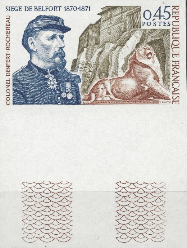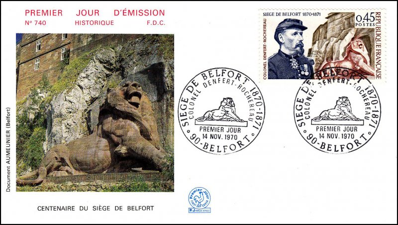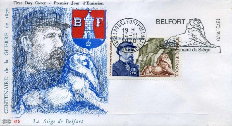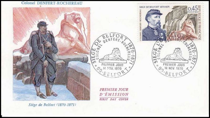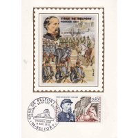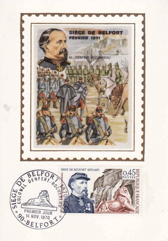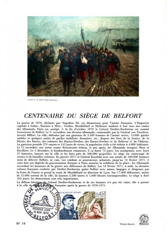 | Commentaire | Visuel : le Colonel Aristide Denfert-Rochereau, né le 11 janv.1823 à Saint-Maixent-l'École. (79-Deux-Sèvres), décédé le 11 mai 1878 à Versailles. (78-Yvelines), défenseur, avec ses soldats et l'aide de la population, de la place fortifiée de Belfort, surnommé le "Lion de Belfort", durant la guerre franco-prussienne de 1870. + le Lion en haut-relief, dans la falaise de la citadelle. |