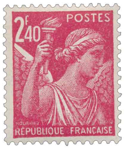 | Commentaire | Le timbre Iris 2,40 F rose carminé appartient à la deuxième série Iris émise en 1944, dans une période de reprise progressive des émissions d’usage courant après la Libération. Représentant la déesse Iris, messagère ailée, cette série prolonge une iconographie républicaine déjà bien installée avant-guerre. Dessiné et gravé par Georges Hourriez, ce timbre est imprimé en typographie, procédé robuste et parfaitement adapté aux très forts tirages nécessaires au fonctionnement quotidien des services postaux. Mis en vente le 4 octobre 1944, il répond à des besoins d’affranchissement intermédiaires, ce qui explique une diffusion massive et homogène sur l’ensemble du territoire métropolitain. |