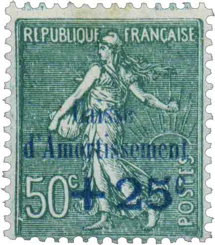 | Commentaire | Semeuse lignée - Caisse d'amortissement. Ce timbre a été démonétisé . Nota Les ombres portées sur la Semeuse sont mal positionnées par rapport au soleil, de plus elle sème contre le vent Émis le 26 septembre 1927, le timbre Semeuse lignée surchargé +25 c sur 50 c (YT 247) appartient à la première série d’émissions destinées à financer la Caisse d’Amortissement, organisme créé pour réduire la dette colossale de l’État après la Grande Guerre. Cette émission figure parmi les plus rares de toutes les Semeuses, avec un tirage extrêmement bas de seulement 449 260 exemplaires, un chiffre exceptionnel pour cette époque. Le timbre reprend la Semeuse lignée de Louis-Oscar Roty, gravée par Mouchon, identifiable à ses arrière-plans rayés et son soleil à l’horizon. La surcharge +25 c venait augmenter l’affranchissement tout en prélevant une taxe destinée à la gestion de la dette publique, ce qui confère à cette vignette un double rôle : postal et fiscal. Imprimé en typographie, dentelé 14 × 13½, et tiré en feuilles de 100, ce timbre se distingue par sa nuance vert blanc, une couleur peu commune dans les émissions contemporaines. Mis en vente jusqu’au 30 septembre 1928, il est aujourd’hui recherché pour son tirage restreint, sa place centrale dans les séries caritatives de la Caisse d’Amortissement et les variétés de surcharge que l’on peut rencontrer sur certains exemplaires. Dans les collections thématiques, ce timbre constitue une pièce incontournable pour les amateurs de Semeuses, de surcharges de la IIIᵉ République, et des émissions au profit d'organismes publics, marquant un moment emblématique de l’histoire fiscale française.