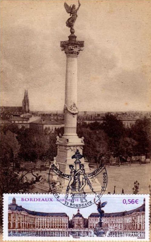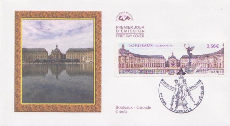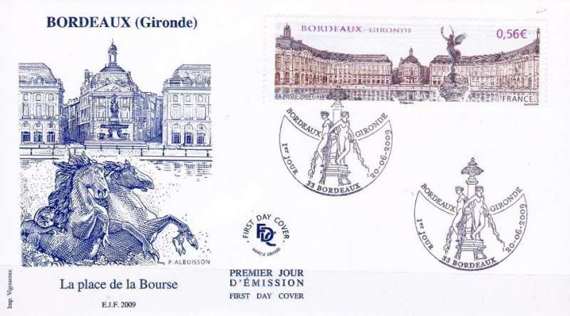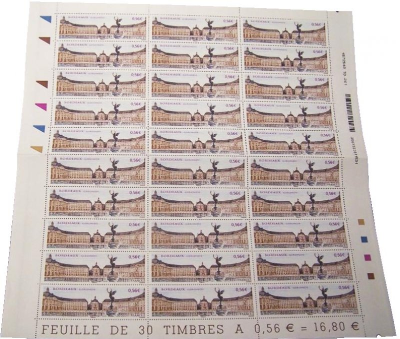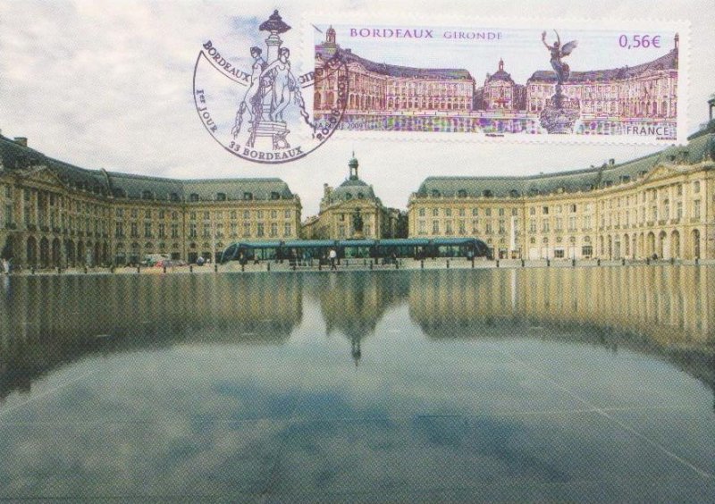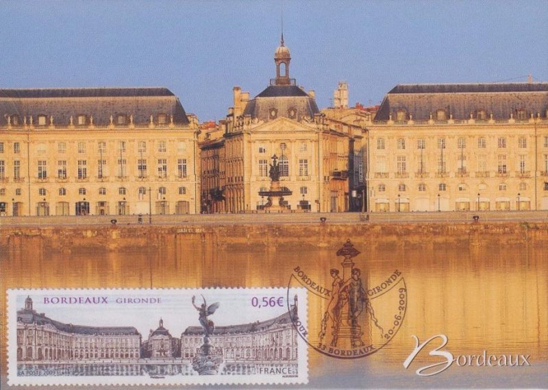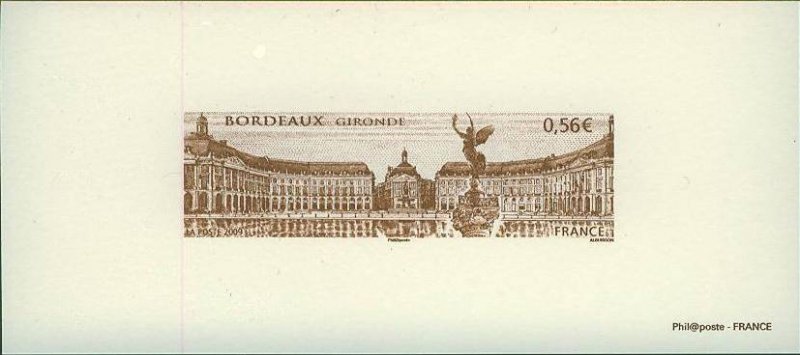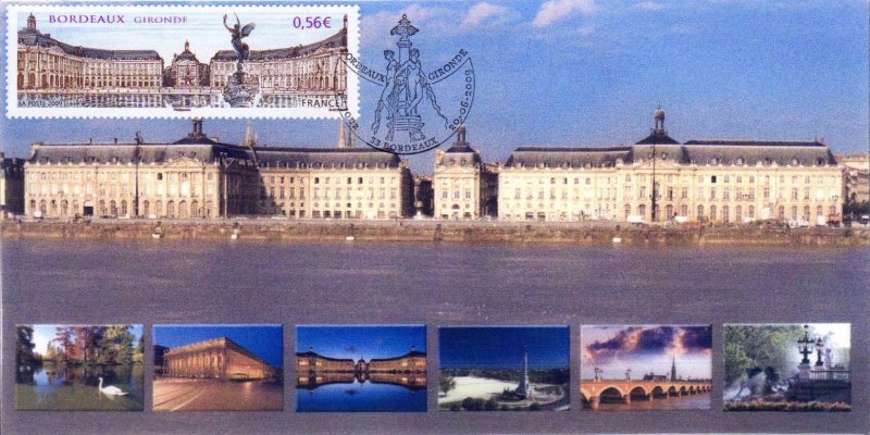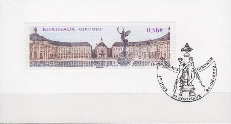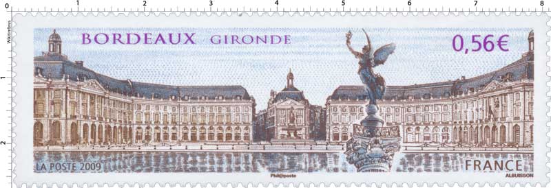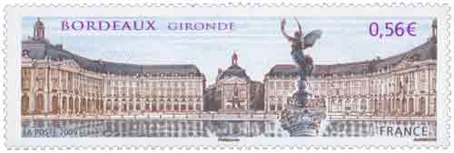 | Commentaire | Existe également en autoadhésif. La manifestation premier jour a lieu les 20 et 21 juin sur la place des Quinconces et près du miroir d'eau situé entre la place de la Bourse représentée sur le timbre et le fleuve. Également visible place de la Bourse, la fontaine des Trois-Grâces.