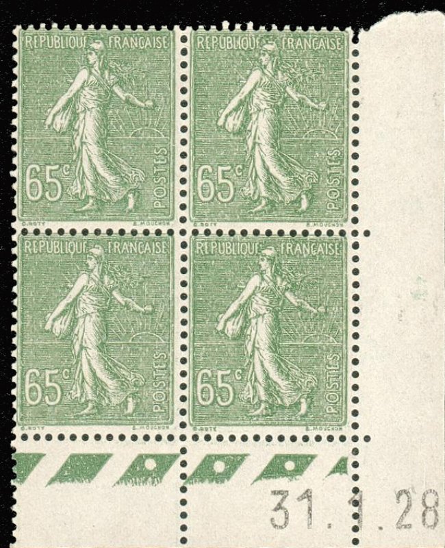 | Commentaire | Semeuse lignée. Nota Les ombres portées sur la Semeuse sont mal positionnées par rapport au soleil, de plus elle sème contre le vent voir la vidéo "Histoires de timbres" Mis en vente en janvier 1927, le 65 centimes olive au type Semeuse lignée s’inscrit dans la continuité des grandes séries d’usage courant imaginées par Louis-Oscar Roty au tout début du XXᵉ siècle. Gravé par Louis-Eugène Mouchon et imprimé en typographie, ce timbre respecte le format classique des Semeuses lignée : vignette de 18 × 22 mm, fond hachuré, soleil à l’horizon (sauf exceptions tardives), et dentelure 14 × 13½. Cette valeur de 65 centimes, réémise à plusieurs reprises depuis 1924, occupe en 1927 une place importante dans la structure tarifaire, notamment pour les lettres simples à destination de l’étranger ou certains imprimés. Sa teinte olive, parfois sujette à de légères variations d’intensité selon les tirages, constitue un critère d’identification apprécié des philatélistes spécialisés, tout comme la finesse des lignes du fond ou l’alignement de la surfrappe typographique. Retiré de la vente en décembre 1931, ce timbre appartient à une période de transition où les Semeuses lignée coexistent avec les premiers Pasteur et les dernières émissions du Type Blanc. Bien qu’aucune quantité d’émission fiable ne soit conservée, le 65 c olive reste un incontournable des collections classiques : il illustre la longévité exceptionnelle du type Semeuse, véritable symbole de la Marianne avant l’heure, déjà omniprésent sur le courrier français depuis plus de vingt ans. |