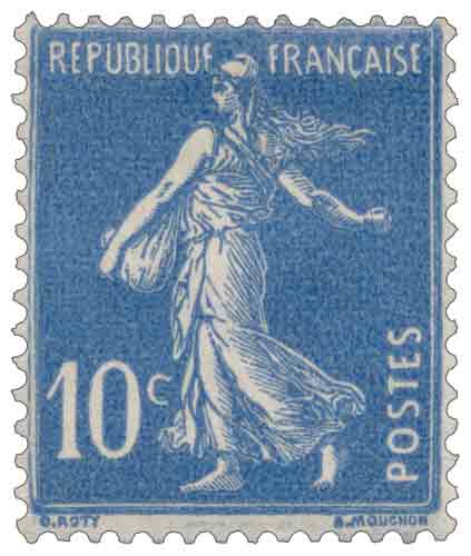 | Commentaire | Semeuse camée. Type III. Voir la vidéo "Histoires de timbres" En savoir plus sur Wikipédia : semeuse camée Émise en septembre 1932, la Semeuse fond plein – inscriptions grasses – 10 centimes outremer (YT 279) marque une nouvelle étape dans l’adaptation du type emblématique de Roty aux besoins postaux de l’entre-deux-guerres. Cette valeur de 10 c, couramment utilisée dans les affranchissements combinés ou pour compléter les tarifs, se caractérise par une impression soignée et une lisibilité renforcée grâce aux inscriptions épaissies introduites au début des années 1930. Le motif reste fidèle au dessin original d’Oscar Roty, inspiré de l’allégorie républicaine semant à contre-vent, symbole de travail et de renouveau. Ici encore, le fond plein — ou Semeuse camée — offre un contraste homogène, mettant en valeur la silhouette dynamique de la figure. L’exécution typographique assurée par Louis-Eugène Mouchon traduit une maîtrise technique indiscutable malgré les cadences industrielles élevées de l’époque. La couleur outremer, assez dense et parfois légèrement variable selon les tirages, est typique des émissions destinées à être immédiatement repérées dans les cases de carnets et tiroirs postaux. Dentelé 14 × 13½ et imprimé en feuillets de 100 timbres, ce 10 centimes s’inscrit pleinement dans la continuité du type Semeuse modernisé. Retiré de la vente le 1er octobre 1938, il reste aujourd’hui un timbre courant mais incontournable pour les collectionneurs spécialisés dans les nuances, les barres de contrôle ou les variétés de centrage. Les exemplaires frais, d’un outremer profond et bien frappé, sont particulièrement recherchés pour compléter une étude thématique des Semeuses tardives. |