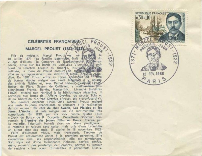 | Commentaire | Surtaxe au profit de la Croix-Rouge française Visuel : Marcel Proust et le vieux pont Saint-Hilaire à Illiers (Combray) enjambant le Loir. Dans le roman, il s'agit d'un pont sur la Vivonne, dans le bourg de Combray. Le “Combray” que connaît le lecteur de la "Recherche du temps perdu" est bien une création littéraire. C'est l’amalgame des deux lieux où le petit Marcel Proust passa les plus belles heures de son enfance, dans la maison de son grand-oncle maternel Louis Weil à Auteuil et la maison de l’oncle Jules Amiot à Illiers, des lieux où il passa régulièrement ses vacances jusqu’à l’âge de dix ans. |