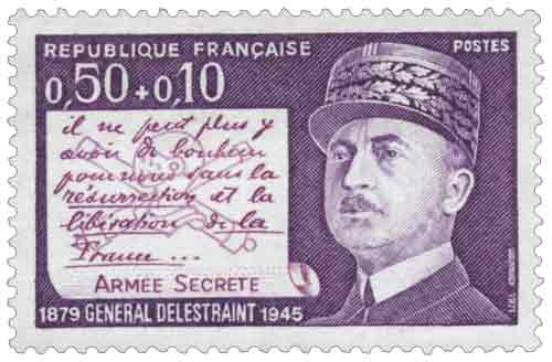 | Commentaire | Le timbre-poste émis le 18 octobre 1971 rend hommage à Charles Delestraint (1879-1945), figure majeure de la Résistance française, dont le parcours militaire et l’engagement clandestin incarnent la continuité entre l’armée d’avant-guerre et la lutte intérieure contre l’occupation. Né à Biache-Saint-Vaast, formé à Saint-Cyr, Delestraint se distingue durant la Première Guerre mondiale avant de connaître une longue captivité, expérience fondatrice d’un sens aigu du devoir et de la discipline. Promu dans l’entre-deux-guerres au sein de l’arme blindée, il devient l’un des proches collaborateurs du général Estienne et adhère très tôt aux conceptions novatrices sur l’emploi des chars, défendues notamment par le colonel de Gaulle, se heurtant à l’inertie doctrinale de l’état-major. Mis à la retraite en 1939, il s’engage dès l’armistice dans l’action clandestine et, installé à Bourg-en-Bresse, structure des réseaux en s’appuyant sur les spécialistes de l’arme cuirassée. En octobre 1942, la France libre lui confie la mission capitale de coordonner et commander l’ensemble des réseaux métropolitains de l’Armée secrète, rôle qui fait de lui l’un des piliers de l’unification de la Résistance intérieure. Après un séjour à Londres aux côtés de Jean Moulin au début de 1943, il œuvre à la mise en place du dispositif du Vercors et intensifie les liaisons et sabotages en vue du débarquement allié. Arrêté à Paris le 9 juin 1943, incarcéré à Fresnes puis déporté successivement au Struthof et à Dachau, il oppose à ses geôliers une dignité et une fermeté unanimement reconnues par ses compagnons de détention. Il est exécuté le 19 avril 1945, quelques jours avant la libération du camp. La figurine, dessinée et gravée en taille-douce par Jean Pheulpin, associe le portrait du général à un document portant la phrase « Il ne peut plus y avoir de bonheur pour nous sans la résurrection et la libération de la France », condensant l’esprit de sacrifice et l’idéal patriotique de l’Armée secrète. Par sa surtaxe au profit de la Croix-Rouge française, cette émission s’inscrit aussi dans la tradition philatélique de solidarité, renforçant la portée mémorielle et civique de l’hommage. Article rédigé pour WikiTimbres |
