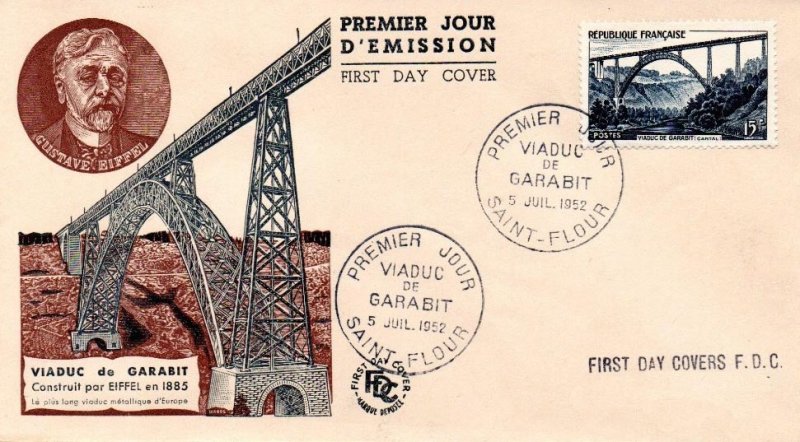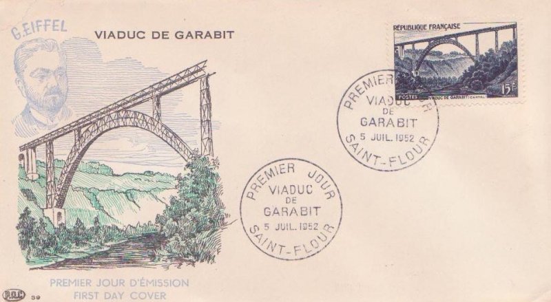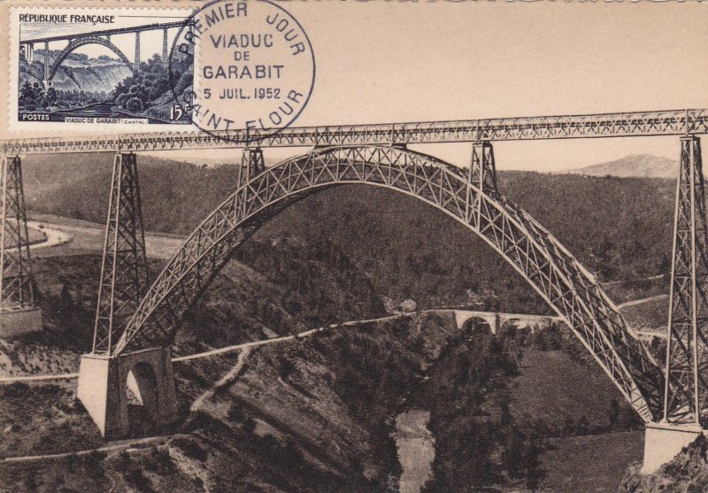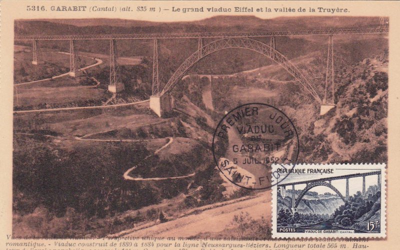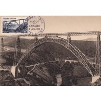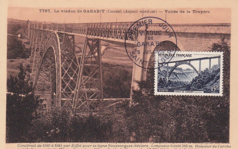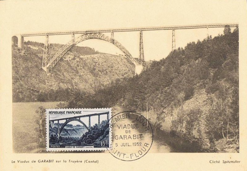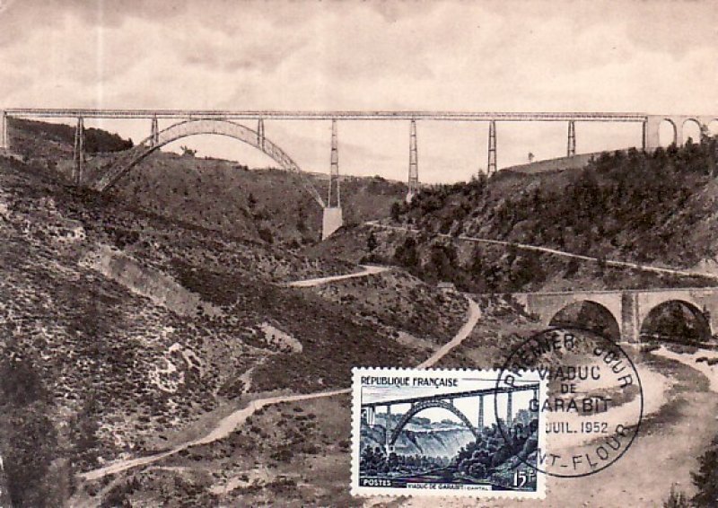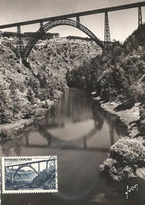 | Commentaire | Viaduc de Garabit Viaduc de Garabit (15-Cantal) : c'est un ouvrage d'art ferroviaire, de type viaduc (au Point Kilométrique 675) de la ligne de Béziers (34-Hérault) à Neussargues (15-Cantal, dite "ligne des Causses"), permettant le franchissement des gorges de la Truyère (affluent du Lot). Ce viaduc est un projet de l'ingénieur Léon Boyer (1851-1886), qui en a confié la finalisation et la réalisation à Gustave Eiffel (1832-1923) et sa société. La ligne est mise en service par la Compagnie des chemins de fer du Midi et du Canal latéral à la Garonne concessionnaire de la ligne. Le viaduc se situe entre les gares de Garabit (à 835 m d'altitude) et de Ruynes-en-Margeride (à 832 m d'altitude) fermées depuis la fin du XXe siècle. |