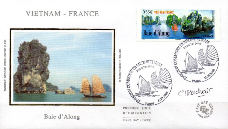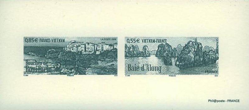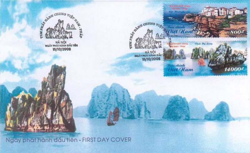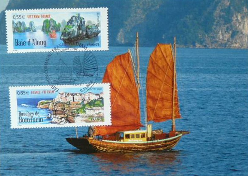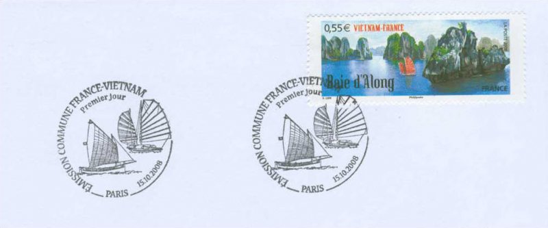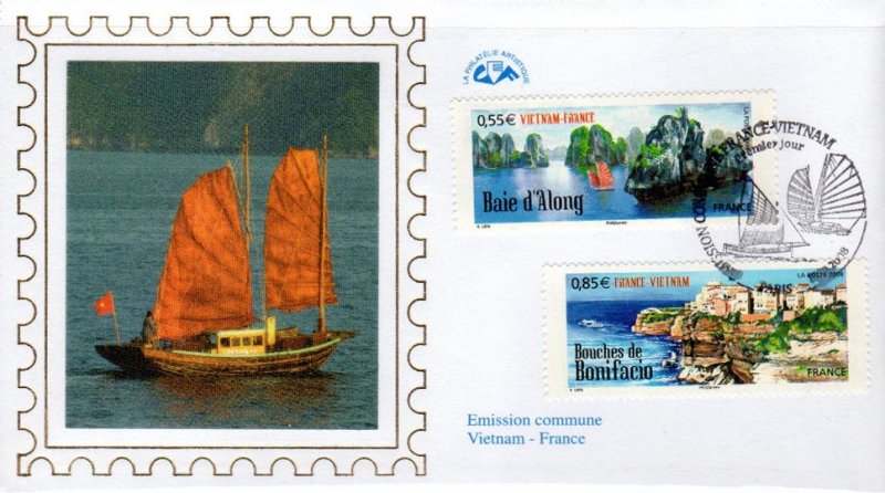 | Commentaire | La manifestation premier jour a lieu le 15 novembre à Bonifacio et au siège de l'Union générale des Vietnamiens de France, à Paris. Claude Perchat dessine une voile latine et un sampan, deux types de bateaux des deux régions dépeintes sur les timbres |