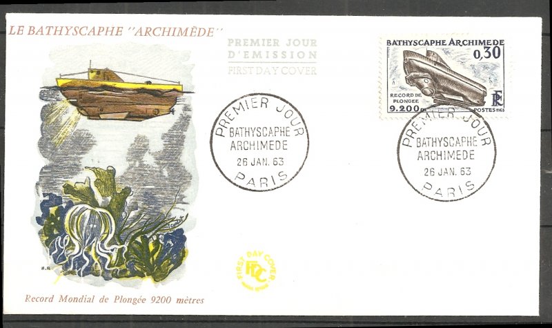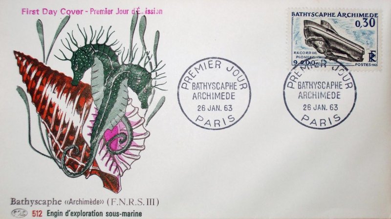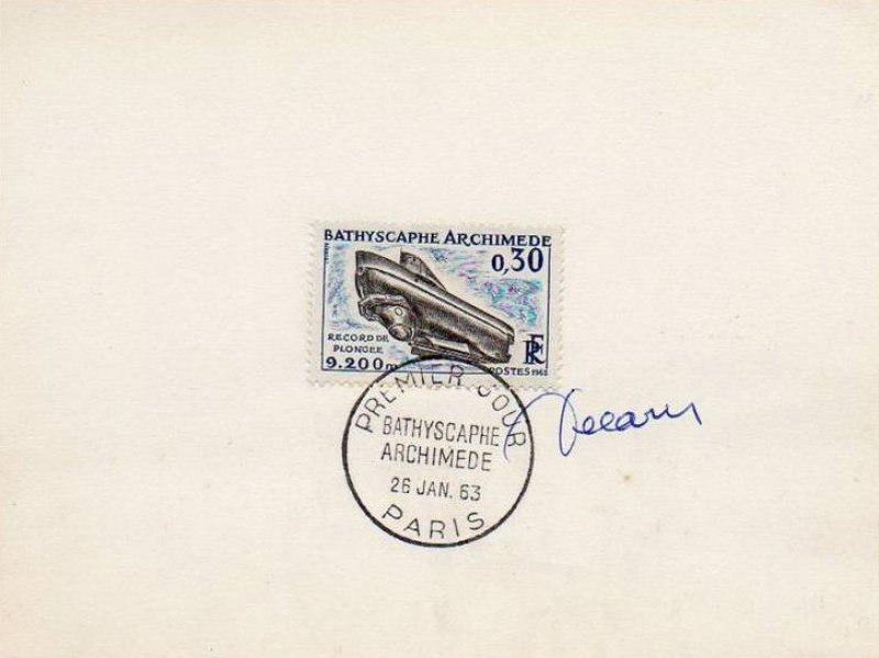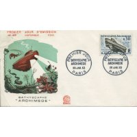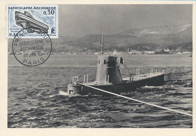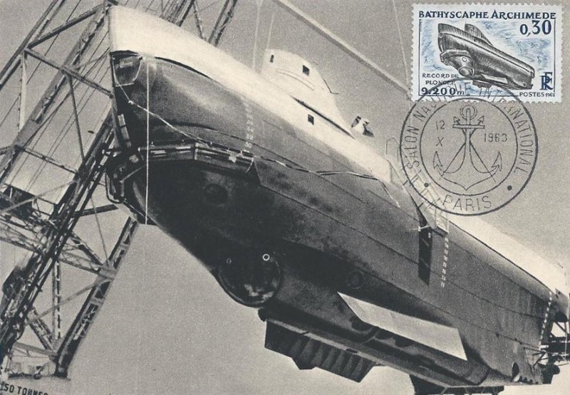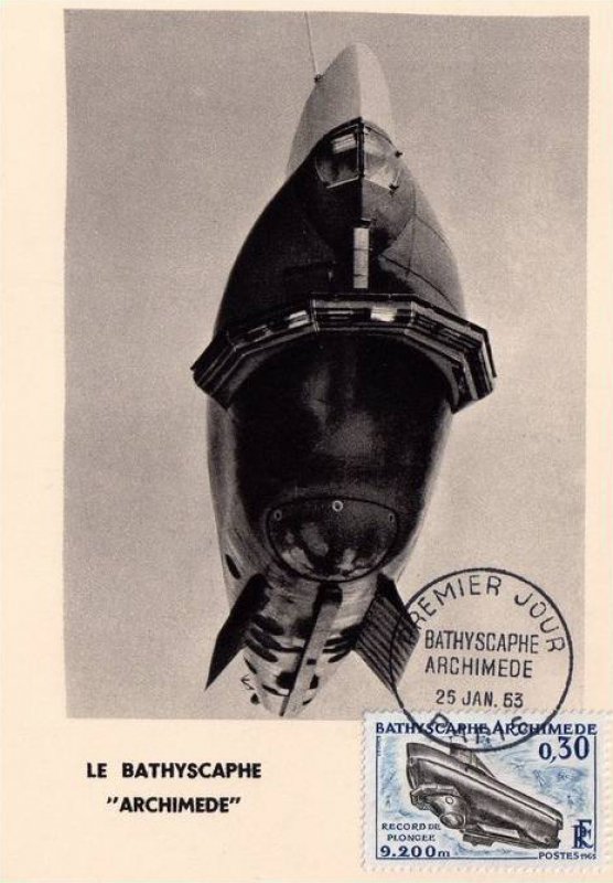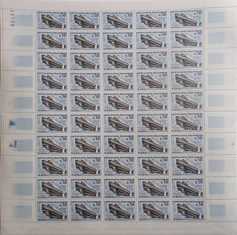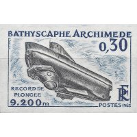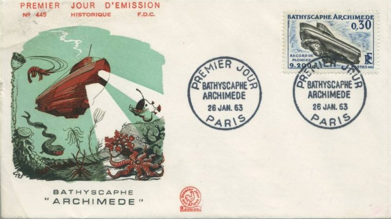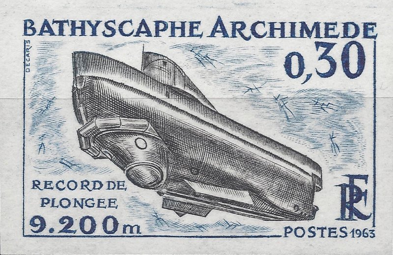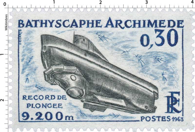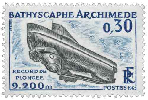 | Commentaire | Voir la vidéo "Histoires de timbres" Le 26 janvier 1963, la France met à l’honneur une formidable avancée technologique avec l’émission d’un timbre consacré au bathyscaphe Archimède, marquant une étape clé dans l’exploration sous-marine. À une époque où la conquête spatiale fascine, l’Archimède symbolise l’autre grande aventure scientifique : celle des abysses. Conçu par le Service technique des constructions navales en collaboration avec le CNRS, ce géant des mers, long de 21 mètres, fonctionne librement dans les profondeurs grâce à un lest de grenaille de fonte et une réserve d’essence pour remonter. Fruit des travaux du professeur belge Auguste Piccard, l’Archimède est une prouesse : il peut atteindre jusqu'à 11 000 mètres de profondeur, là où aucune lumière ne pénètre et où la pression est titanesque. Au cours de sa première grande mission en 1962, l'Archimède a exploré la fosse des Kouriles et la mer du Japon. Cette expédition, longue de quatre mois, a permis de corriger des mesures bathymétriques erronées et d’apporter des observations inédites sur les courants marins ainsi que sur les formes de vie abyssales. De précieux échantillons de sédiments ont été récoltés jusqu’à 9 200 mètres, enrichissant la compréhension des fonds océaniques, alors encore largement méconnus. Au-delà de la prouesse technologique, l’Archimède incarne l’esprit d’aventure scientifique des années 1960, animé par la volonté de repousser toujours plus loin les frontières du savoir. Sa contribution à l’océanographie moderne annonce une série d’explorations sous-marines qui, aujourd’hui encore, inspirent chercheurs et ingénieurs. WikiTimbres |