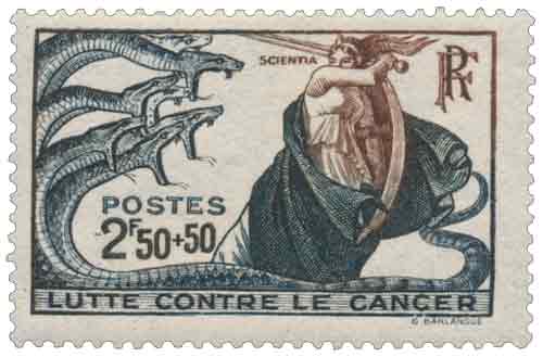 | Commentaire | Voir la vidéo "Histoires de timbres" Le timbre Lutte contre le cancer - Scientia, mis en vente générale le 20 février 1941, est une émission de bienfaisance dont l'iconographie puissante illustre le combat de la Science contre la maladie. Dessiné et gravé par Gabriel-Antoine Barlangue, le motif représente une allégorie terrassant une hydre, symbolisant la lutte médicale. Cette figurine présente une valeur faciale de 2,50 francs, complétée par une surtaxe de 50 centimes reversée à la Ligue nationale française contre le cancer. Bien que le tarif de la lettre pour l'étranger soit passé à 4,00 francs peu avant l'émission, ce timbre servait aux affranchissements de courriers lourds ou aux envois recommandés. Imprimé en taille-douce rotative bicolore sur la presse n° 1, il se présente en feuilles de 25 exemplaires de couleur ardoise et brun, avec une dentelure 13. Ce tirage de 1,23 million d'unités marque l'histoire postale comme étant le premier à avoir bénéficié d'une émission officielle de luxe non dentelée destinée à des personnalités. Le timbre a été retiré de la vente le 17 août 1941. Les collectionneurs privilégient les exemplaires avec coins datés, témoins de la haute technicité maintenue par l'Atelier des timbres-poste malgré les contraintes de l'Occupation. |