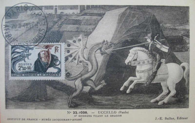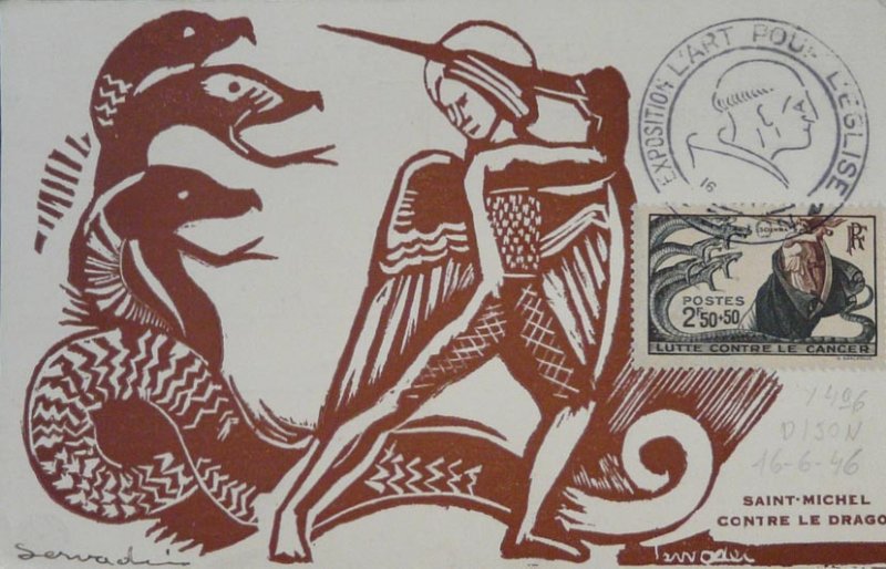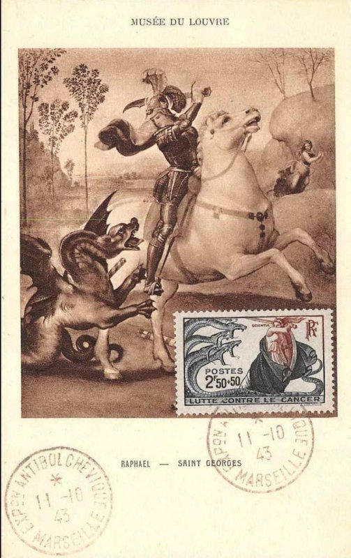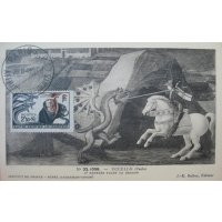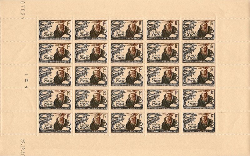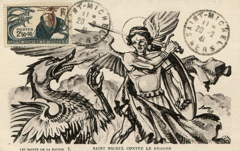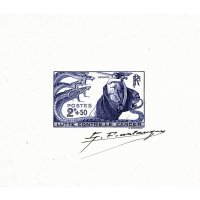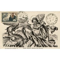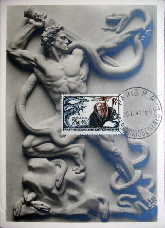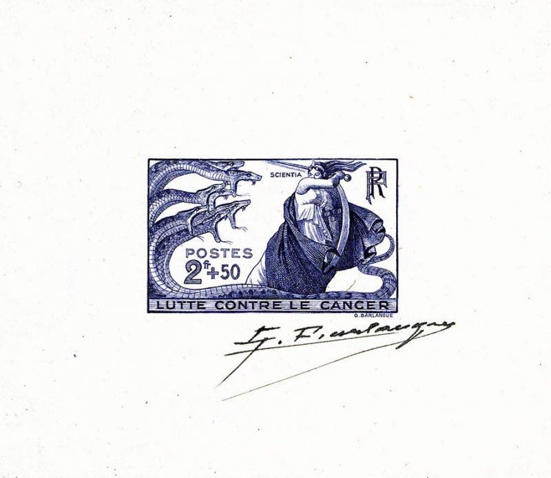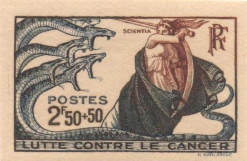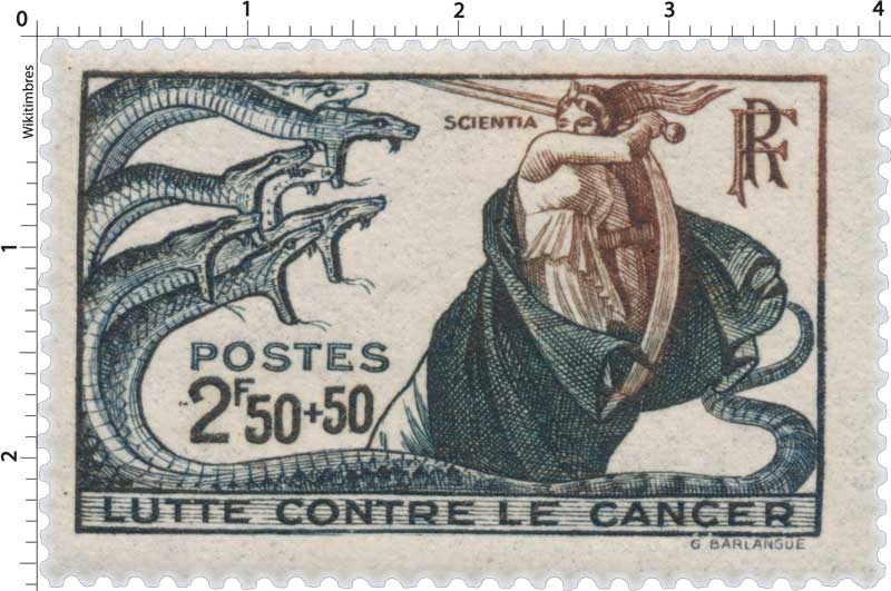| Commentaire | Voir la vidéo "Histoires de timbres" Le timbre Lutte contre le cancer - Scientia, mis en vente générale le 20 février 1941, est une émission de bienfaisance dont l'iconographie puissante illustre le combat de la Science contre la maladie. Dessiné et gravé par Gabriel-Antoine Barlangue, le motif représente une allégorie terrassant une hydre, symbolisant la lutte médicale. Cette figurine présente une valeur faciale de 2,50 francs, complétée par une surtaxe de 50 centimes reversée à la Ligue nationale française contre le cancer. Bien que le tarif de la lettre pour l'étranger soit passé à 4,00 francs peu avant l'émission, ce timbre servait aux affranchissements de courriers lourds ou aux envois recommandés. Imprimé en taille-douce rotative bicolore sur la presse n° 1, il se présente en feuilles de 25 exemplaires de couleur ardoise et brun, avec une dentelure 13. Ce tirage de 1,23 million d'unités marque l'histoire postale comme étant le premier à avoir bénéficié d'une émission officielle de luxe non dentelée destinée à des personnalités. Le timbre a été retiré de la vente le 17 août 1941. Les collectionneurs privilégient les exemplaires avec coins datés, témoins de la haute technicité maintenue par l'Atelier des timbres-poste malgré les contraintes de l'Occupation. |
