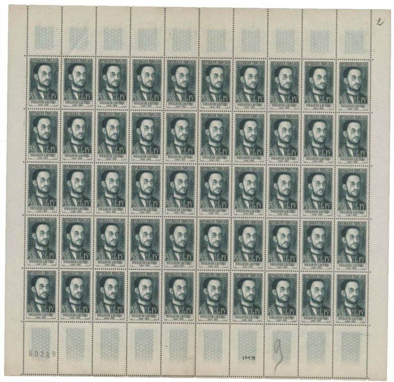 | Commentaire | Timbre grevé d'une surtaxe au profit de la Croix-Rouge française Le timbre-poste français de 1958 consacré à Henri de Toulouse-Lautrec appartient à la série des Personnages français célèbres émise au profit de la Croix-Rouge française, cette figurine gommée rendant hommage à l’un des artistes majeurs de la fin du XIXᵉ siècle, dont l’œuvre a profondément renouvelé le regard porté sur la vie moderne et les milieux populaires parisiens. Émis pour des usages postaux de valeur élevée, notamment l’affranchissement de la lettre double pour l’intérieur et de la lettre simple pour l’étranger, ce timbre de France de l’année 1958 s’inscrit dans une série cohérente associant commémoration culturelle et finalité caritative par l’application d’une surtaxe. Dessiné par Michel Ciry et gravé par René Cottet, le timbre adopte un format vertical et une gravure en taille-douce rotative, technique privilégiée pour restituer avec précision les traits du portrait et assurer une bonne lisibilité malgré la forte valeur faciale ; une information historiquement établie rappelle que Toulouse-Lautrec est considéré comme l’un des pères de l’affiche moderne, notamment par ses lithographies emblématiques du Moulin Rouge et des cafés-concerts, qui ont durablement influencé le graphisme du XXᵉ siècle. |
