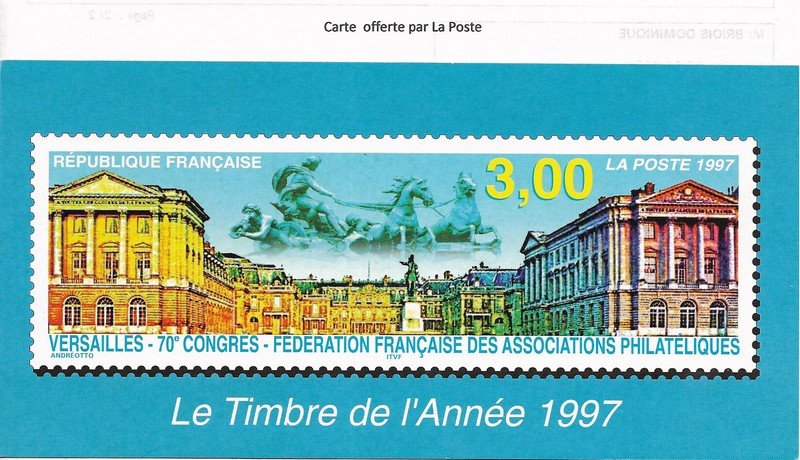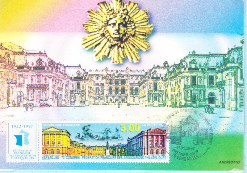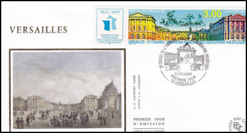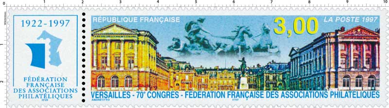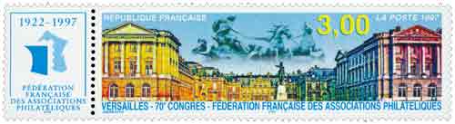 | Description | 70e Congrès de la Fédération Française des Associations Philatéliques, à Versailles, représentation des façades donnant sur la place d'armes et la statue équestre du roi Louis XIV |