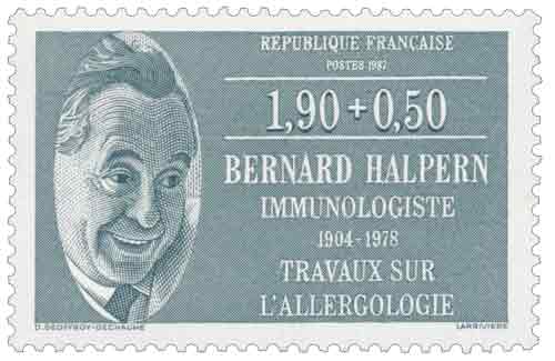 | Commentaire | Les timbres imprimés en feuille ont une gomme mate. Ceux imprimés en carnets ont une gomme brillante. Issu de la série consacrée aux médecins et biologistes, ce timbre rend hommage à Bernard Halpern, figure marquante de l’immunologie et de l’allergologie françaises du XXe siècle. Né en 1904 dans l’Empire russe et formé en France après un parcours marqué par l’exil et des conditions matérielles difficiles, Halpern s’impose dès l’entre-deux-guerres par des travaux novateurs à la frontière de la pharmacologie et de la biologie. Son activité scientifique s’intensifie à partir de la fin des années 1930, lorsqu’il oriente ses recherches vers les mécanismes de l’allergie et de l’anaphylaxie, dans un contexte où ces phénomènes restent encore mal compris. Au cours de la Seconde Guerre mondiale, il participe à la mise au point des premiers antihistaminiques de synthèse, ouvrant la voie à des traitements destinés à neutraliser les effets de l’histamine et à prévenir les chocs allergiques. Après 1945, son intégration au Centre national de la recherche scientifique et son activité à l’hôpital Broussais renforcent son rôle structurant dans l’organisation de la recherche immunologique en France. Les travaux menés sous sa direction portent aussi bien sur la phagocytose que sur l’immunologie des greffes et sur l’exploration de substances capables de stimuler les défenses de l’organisme, illustrant l’essor d’une médecine expérimentale fondée sur des bases scientifiques rigoureuses. L’émission de ce timbre en 1987 s’inscrit dans une politique postale visant à mettre en lumière les réalisations françaises dans le domaine médical, en rappelant l’importance des avancées thérapeutiques issues de la recherche fondamentale et appliquée. Ce timbre participe ainsi à la reconnaissance institutionnelle d’un parcours scientifique étroitement lié à l’histoire contemporaine de la médecine et de la biologie en France. Article rédigé pour WikiTimbres |