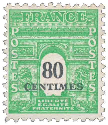 | Commentaire | Le timbre gommé de 1945 « Arc de Triomphe de Paris » à 80 centimes vert et noir appartient à la 4ᵉ série du Gouvernement provisoire, conçue pour réajuster les valeurs faciales aux tarifs postaux applicables au début de l’année 1945 après les déséquilibres constatés sur la série de 1944. Mis en vente le 12 février 1945, il est destiné à l’affranchissement des imprimés pour l’étranger, usage spécifique nécessitant une valeur élevée dans la grille tarifaire de l’époque. Comme pour l’ensemble de la série, la valeur faciale est imprimée en noir lors d’un second passage, procédé caractéristique de cette émission transitoire visant à corriger rapidement l’inadéquation des tarifs antérieurs. Cette tentative d’ajustement reste cependant de courte durée, les tarifs postaux étant modifiés à nouveau quelques semaines après la diffusion de la série. Le choix iconographique de l’Arc de Triomphe, monument emblématique de Paris et symbole de la mémoire nationale, répond à une volonté de continuité et de rassemblement dans le contexte de l’immédiat après-guerre. Le dessin est réalisé par William A. Roach d’après une photographie fournie par la bibliothèque municipale de Washington, tandis que la gravure est confiée à une équipe de graveurs américains, illustrant le cadre de coopération internationale propre à la période 1944-1945. |