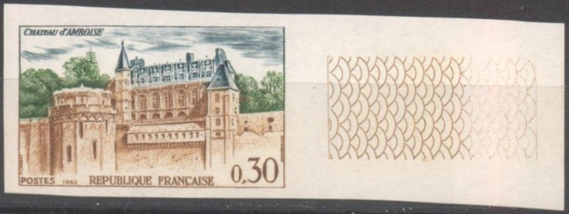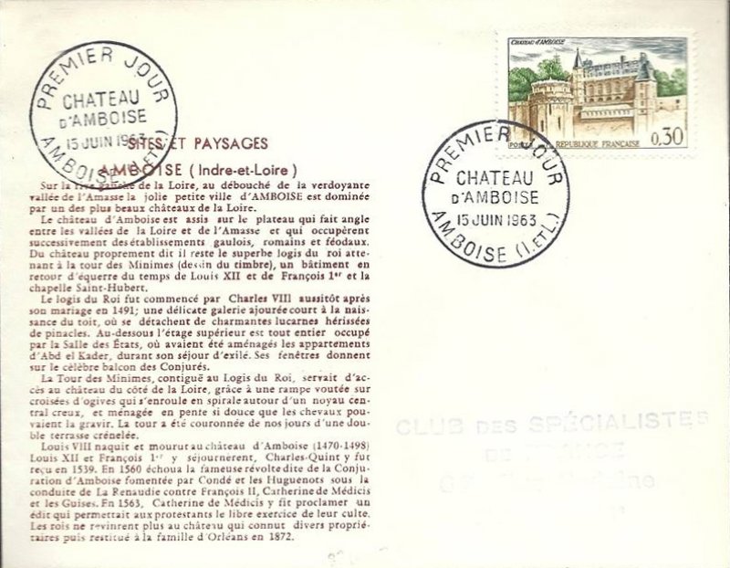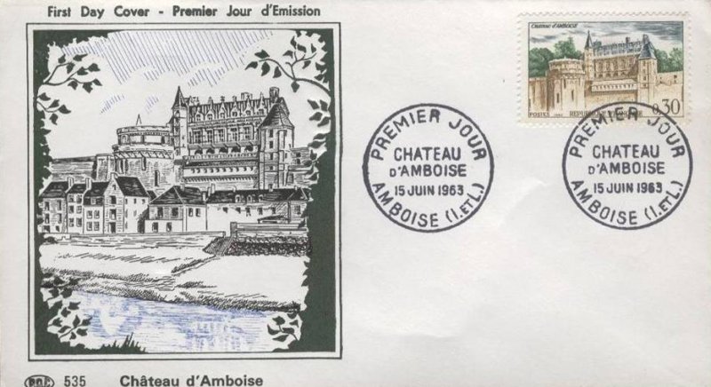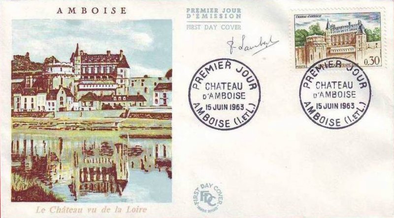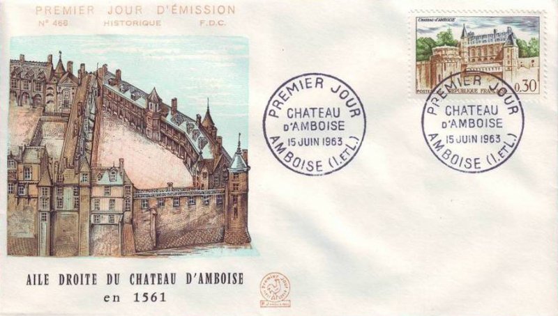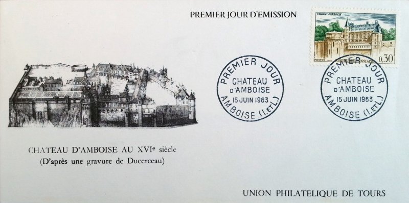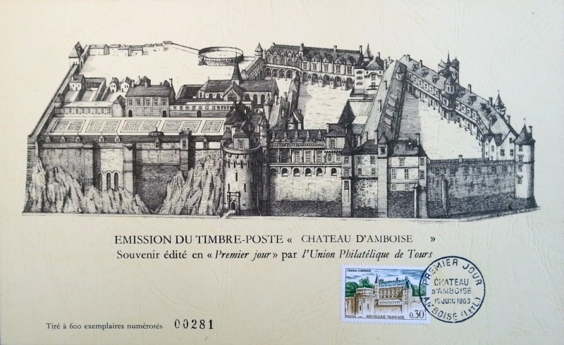 | Commentaire | D’un bleu-gris nuancé, rehaussé de verts et d’ocre, le timbre émis en 1963 consacré au château d’Amboise impose d’emblée une atmosphère douce et contemplative. Le regard est invité à embrasser la façade sud du château, ses tours, ses remparts, et cette terrasse ouverte sur la Loire. La gravure, tout en finesse, donne une impression de majesté paisible, presque silencieuse, à cette silhouette royale ancrée dans leVal de Loire. L’image ne cherche pas l’effet spectaculaire : elle évoque le temps long, la pierre patinée, et l’héritage des rois. Le château d’Amboise n’est pas un simple décor. Il est un pan vivant de l’histoire de France. Résidence favorite des rois Valois à la Renaissance, il a accueilli les plus grands noms : François Ier, Léonard de Vinci (qui y est enterré), Catherine de Médicis… C’est un lieu de pouvoir et de culture, mais aussi de ruptures historiques — le souvenir des guerres de Religion y flotte encore. Ce choix, en 1963, pour illustrer une série touristique, dit quelque chose de l’image que la France souhaite alors projeter : celle d’un pays de patrimoine, d’élégance discrète, d’ancrage dans une mémoire prestigieuse. Le visuel est l’œuvre de Pierrette Lambert, artiste rare dans l’univers philatélique de l’époque, et gravé par Claude Hertenberger, dont la main experte donne relief et équilibre à la composition. L’émission s’inscrit dans une série dite « d’usage courant touristique », destinée à voyager au dos de millions de cartes postales envoyées à l’étranger. Aujourd’hui encore, ce timbre est apprécié pour sa sérénité graphique. Il n’est pas clinquant, mais il raconte — avec retenue — une part de la grandeur française. ©WikiTimbres |