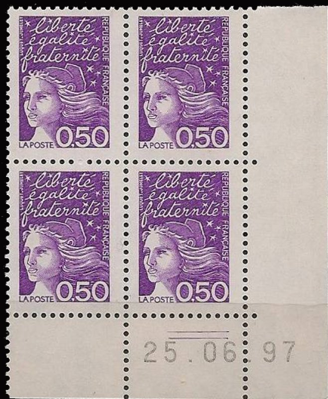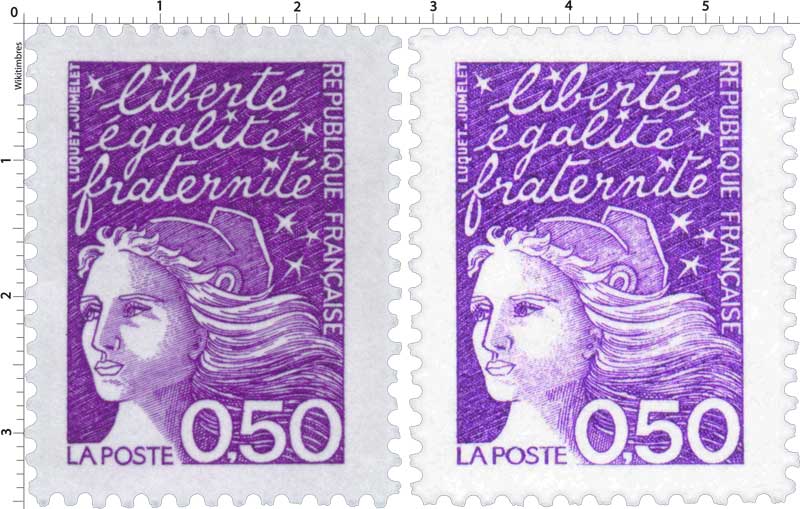 | Commentaire | Marianne de Luquet. Type I. (Type II à droite). Le timbre au type I existe non surchargé de bandes phosphorescentes. Le timbre au type II existe avec gomme mate ou dite tropicale. Existe non surchargé accidentellement de bandes phosphorescentes. A ne pas confondre avec le timbre issu du bloc dont la dentelure est 13 x 13 1/4. |