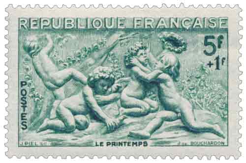 | Commentaire | Émis en 1949, le timbre-poste gommé intitulé Le Printemps appartient à la série artistique française consacrée aux Quatre saisons par Edme Bouchardon, ensemble philatélique visant à mettre en valeur le patrimoine sculpté du XVIIIᵉ siècle à travers des œuvres emblématiques conservées à Paris. Dessiné et gravé par Jules Piel, ce timbre horizontal reproduit le bas-relief représentant le Printemps situé au pied de l’une des statues monumentales de la fontaine des Quatre-Saisons, édifiée rue de Grenelle, dans le 7ᵉ arrondissement, chef-d’œuvre de la sculpture décorative parisienne achevé au milieu du siècle des Lumières. Imprimé en taille-douce rotative, procédé privilégié pour les émissions artistiques de qualité de l’après-guerre, le timbre restitue avec précision le modelé du relief et la douceur des formes caractéristiques du style de Bouchardon. Sa place dans la série est celle d’une valeur d’introduction, associée à une surtaxe au profit de la Croix-Rouge française, et son usage postal correspond à des affranchissements spécifiques, notamment pour des envois à destination des militaires et des imprimés urgents, assurant une diffusion réelle en 1949. Cette émission illustre la volonté de l’administration postale française de conjuguer fonction utilitaire du timbre, soutien humanitaire et valorisation du patrimoine artistique national issu du XVIIIᵉ siècle.