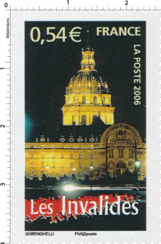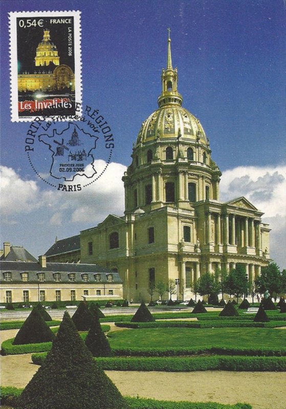 | Commentaire | Visuel : l'Hôtel des Invalides (75-Paris), dont la construction fut ordonnée par Louis XIV par l'édit royal du 24 fév.1670, pour abriter les invalides de ses armées. L'ensemble est constitué d'un hôpital, d'une maison de retraite, de 2 églises avec un dôme et d'une nécropole militaire - les architectes : Libéral Bruand (1636-1697) et Jules Hardouin-Mansart (1646-1708) |