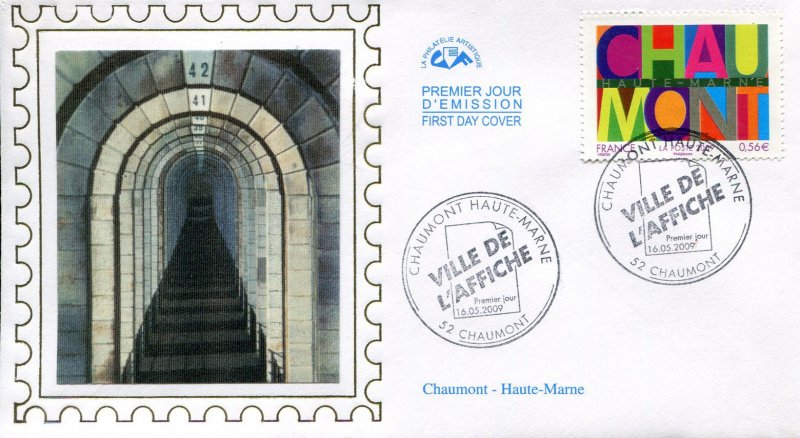 | Commentaire | Aurélie Baras crée le cachet premier jour titré « VILLE DE L'AFFICHE » disponible pendant la mise en vente anticipée le 16 mai à Chaumont. La cité, dont le nom était à l’origine «Calvus Mons », fut la résidence des comtes de Champagne de 1228 à 1239, date du rattachement de ce fief à la couronne. Bien défendue par la nature du site, la ville a gardé une part de son caractère féodal. Il subsiste encore le donjon de l’ancien château fort. Riche d’un important fonds d’affiches anciennes et contemporaines, la ville de Chaumont s’est dotée de plusieurs manifestations annuelles parmi lesquelles le Festival international de l’Affiche et du graphisme fêtera son 20e anniversaire en 2009. À cette occasion, la ville de Chaumont a souhaité lancer un concours réunissant une cinquantaine de candidats dont voici le visuel lauréat. |