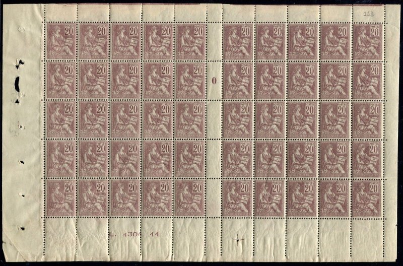 | Commentaire | Mouchon. Type I. Mis en vente le 4 décembre 1900, le 20 centimes brun lilas au type Mouchon I est l’une des valeurs intermédiaires de la série Mouchon, conçue pour remplacer progressivement les derniers timbres Sage dans cette tranche tarifaire. Cette valeur couvre principalement les affranchissements du deuxième échelon intérieur ainsi que certains envois internationaux nécessitant un complément de port. Le dessin du Type I, encore non retouché, se distingue par la finesse des lignes et par l’absence des corrections qui seront apportées en 1902. La nuance brun lilas varie selon les tirages, avec des teintes allant du lilas brun clair à des tons plus soutenus. Tiré à un volume relativement faible (5,1 millions), il est nettement moins courant que le 10 c du même type. En oblitéré, les cachets à date des bureaux ordinaires sont les plus fréquents, mais les plis réellement affranchis à 20 centimes restent bien plus recherchés, notamment dans la philatélie classique des années 1900-1903. Cette valeur est retirée de la vente en juillet 1902, peu avant l’introduction des tirages retouchés du Type II. Aucun faux d’époque notable n’est répertorié. |