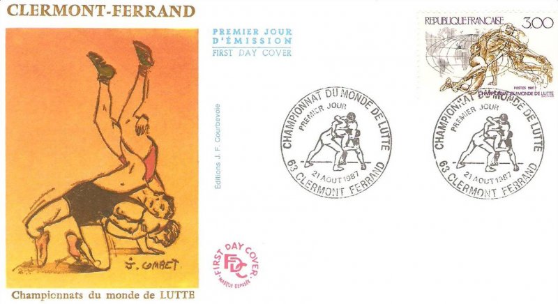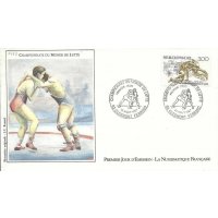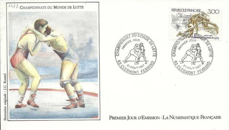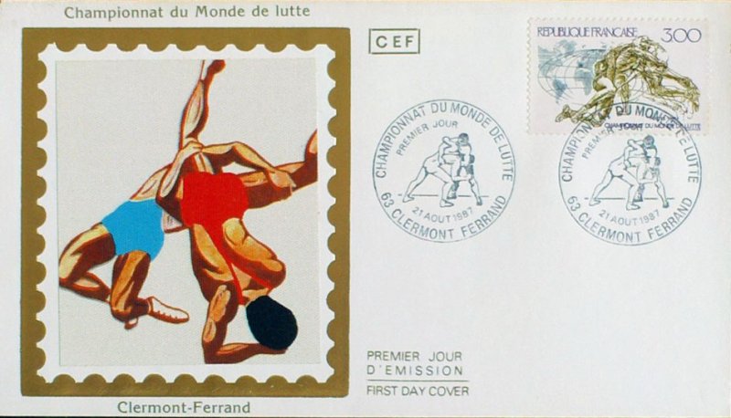 | Commentaire | Historique : la Fédération Internationale de Lutte Amateur (FILA), fondée en 1912, fête cette année son 75e anniversaire. La première langue officielle est le français et elle eut un Français, Roger Coulon, pour président de 1952 à 1971. C'est pourquoi elle a choisi de célébrer solennellement cet anniversaire à l'occasion des championnats du monde 1987, dont elle a confié pour la première fois l'organisation à la France. Ils se dérouleront du 19 au 29 août à Clermont-Ferrand (63-Puy-de-Dôme). |