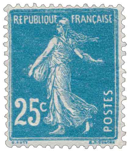 | Commentaire | Semeuse camée. Type IA. (140a) Le n°140a est bleu foncé, le 140b est bleu noir Voir la vidéo "Histoires de timbres" En savoir plus sur Wikipédia : semeuse camée La Semeuse fond plein sans sol 25 centimes bleu, émise le 19 juin 1907, s’inscrit dans la grande série des Semeuses camées adoptées par la France au début du XXᵉ siècle. Dessinée par Oscar Roty et adaptée à l’impression typographique par Louis-Eugène Mouchon, cette valeur de 25 c répond à un besoin essentiel du régime postal : l’affranchissement de nombreuses correspondances intérieures et internationales, en particulier les lettres de second échelon et une large gamme d’imprimés et d’envois combinés. Imprimé en typographie et dentelé 14 × 13½, ce timbre adopte le format standard des Semeuses de la période (20 × 24 mm, vignette 18 × 22 mm). Il est tiré en feuilles de 150, suivant la structure utilisée pour la plupart des émissions courantes avant la Grande Guerre. La couleur bleu apparaît en plusieurs nuances selon les tirages successifs, notamment durant les périodes d’après-guerre où les encres étaient plus variables — un point d’étude apprécié des spécialistes. Le 25 c bleu YT 140 reste l’un des timbres les plus répandus de la série : son usage massif entre 1907 et 1921/1927 explique l’abondance des exemplaires oblitérés, tandis que les exemplaires neufs bien centrés sont plus recherchés. La valeur a également servi de base à plusieurs affranchissements combinés sur documents postaux, ce qui en fait un timbre très présent dans les collections thématiques et dans les études tarifaires de la IIIᵉ République. Représentatif du style épuré de la Semeuse camée, ce timbre marque une étape importante dans la modernisation de l’iconographie postale française. Son fond uniforme — sans les lignes horizontales des Semeuses lignée — souligne davantage la silhouette emblématique de la Semeuse « semant à contre-vent », symbole républicain de diffusion du savoir et du mouvement social. Timbre incontournable des Semeuses fond plein, le YT 140 occupe une place essentielle dans la chronologie postale de 1907 à l’entre-deux-guerres, et reste une référence pour l’étude des nuances, des repiquages typographiques et des usages tarifaires de la période.
