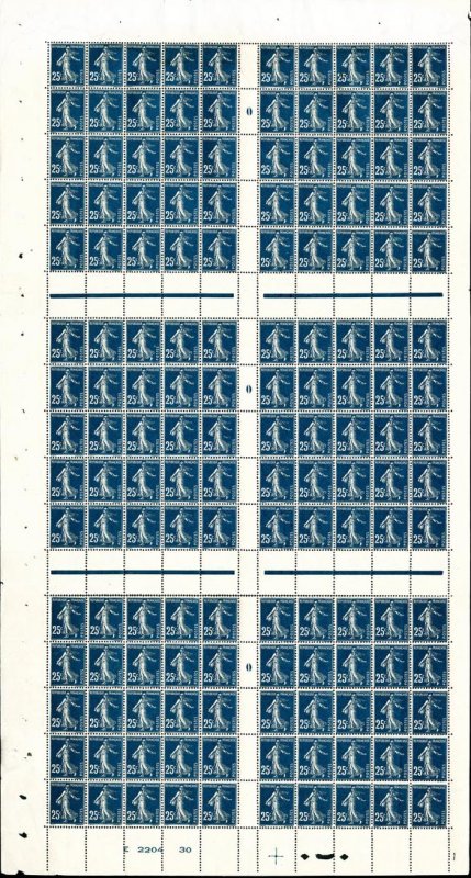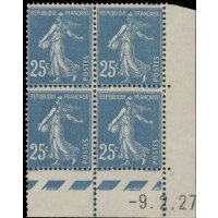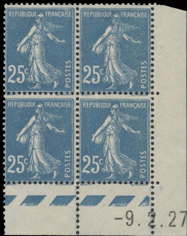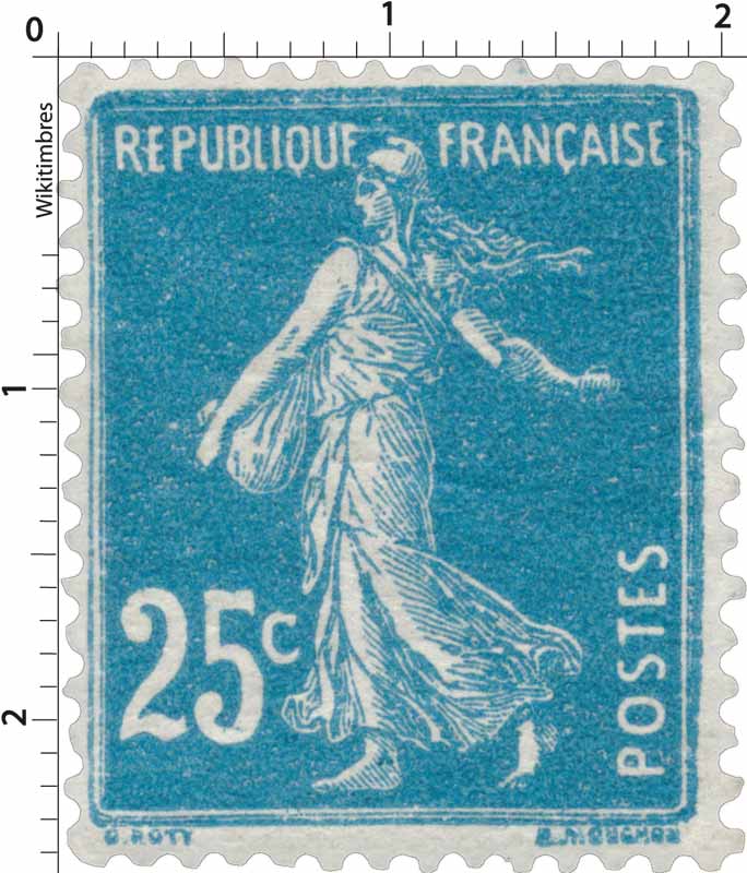 | Commentaire | Semeuse camée. Type IA. (140a) Le n°140a est bleu foncé, le 140b est bleu noir Voir la vidéo "Histoires de timbres" En savoir plus sur Wikipédia : semeuse camée La Semeuse fond plein sans sol 25 centimes bleu, émise le 19 juin 1907, s’inscrit dans la grande série des Semeuses camées adoptées par la France au début du XXᵉ siècle. Dessinée par Oscar Roty et adaptée à l’impression typographique par Louis-Eugène Mouchon, cette valeur de 25 c répond à un besoin essentiel du régime postal : l’affranchissement de nombreuses correspondances intérieures et internationales, en particulier les lettres de second échelon et une large gamme d’imprimés et d’envois combinés. Imprimé en typographie et dentelé 14 × 13½, ce timbre adopte le format standard des Semeuses de la période (20 × 24 mm, vignette 18 × 22 mm). Il est tiré en feuilles de 150, suivant la structure utilisée pour la plupart des émissions courantes avant la Grande Guerre. La couleur bleu apparaît en plusieurs nuances selon les tirages successifs, notamment durant les périodes d’après-guerre où les encres étaient plus variables — un point d’étude apprécié des spécialistes. Le 25 c bleu YT 140 reste l’un des timbres les plus répandus de la série : son usage massif entre 1907 et 1921/1927 explique l’abondance des exemplaires oblitérés, tandis que les exemplaires neufs bien centrés sont plus recherchés. La valeur a également servi de base à plusieurs affranchissements combinés sur documents postaux, ce qui en fait un timbre très présent dans les collections thématiques et dans les études tarifaires de la IIIᵉ République. Représentatif du style épuré de la Semeuse camée, ce timbre marque une étape importante dans la modernisation de l’iconographie postale française. Son fond uniforme — sans les lignes horizontales des Semeuses lignée — souligne davantage la silhouette emblématique de la Semeuse « semant à contre-vent », symbole républicain de diffusion du savoir et du mouvement social. Timbre incontournable des Semeuses fond plein, le YT 140 occupe une place essentielle dans la chronologie postale de 1907 à l’entre-deux-guerres, et reste une référence pour l’étude des nuances, des repiquages typographiques et des usages tarifaires de la période.