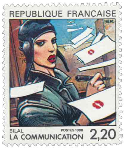 | Commentaire | À la fin des années 1980, la bande dessinée française connaît une reconnaissance institutionnelle sans précédent, marquée notamment par son intégration dans les politiques culturelles et postales. Ce timbre appartient à l’émission collective « La Communication par douze auteurs de la bande dessinée française », conçue en lien étroit avec le Festival international de la bande dessinée d’Angoulême et destinée à illustrer la diversité des écritures graphiques contemporaines. Dans ce contexte, la contribution d’Enki Bilal intervient à un moment charnière de son parcours, alors que son œuvre s’impose comme l’une des plus singulières de la bande dessinée européenne. Le sujet de la communication, volontairement large, permet d’évoquer les tensions, les ruptures et les ambiguïtés propres aux échanges humains à la fin du XXᵉ siècle, thèmes récurrents dans l’univers de Bilal nourri par l’histoire politique et les bouleversements géopolitiques de l’après-guerre. Ce timbre s’inscrit ainsi dans une démarche qui dépasse la simple illustration pour devenir un marqueur culturel : il témoigne de la volonté de l’administration postale française de reconnaître la bande dessinée comme un langage à part entière, capable d’interroger la société contemporaine. L’émission de 1988 prolonge une politique déjà amorcée dans les années 1970 visant à utiliser la bande dessinée comme outil pédagogique et culturel, tout en affirmant sa légitimité artistique. Par son intégration dans un carnet réunissant douze signatures majeures, ce timbre participe à une mise en perspective historique du neuvième art, depuis ses origines populaires jusqu’à son accession au rang d’expression culturelle reconnue, et illustre la place nouvelle accordée aux auteurs contemporains dans la philatélie française. Article rédigé pour WikiTimbres |