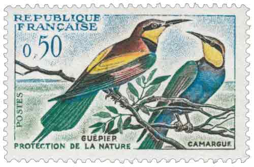 | Commentaire | Le timbre français consacré au guêpier d’Europe s’inscrit dans la série de propagande en faveur de la protection de la nature émise en 1960, destinée à sensibiliser le public à la richesse et à la fragilité de la faune sauvage, en particulier celle des zones humides et des grands couloirs migratoires. Cette figurine représente le guêpier d’Europe (Merops apiaster), oiseau migrateur emblématique de la Camargue, reconnaissable à son plumage vivement coloré et à son long bec incurvé adapté à la capture des insectes en vol, notamment les hyménoptères. Le timbre met en valeur à la fois l’esthétique spectaculaire de l’espèce et le rôle écologique qu’elle joue dans les écosystèmes méditerranéens, tout en s’inscrivant dans une politique postale plus large de diffusion de messages éducatifs liés à la conservation de la nature. Imprimé en taille-douce polychrome, ce timbre de format horizontal appartient à la première génération française de figurines de protection de la nature utilisant une palette de six couleurs, marquant une étape technique et graphique importante dans la philatélie environnementale française. Article rédigé pour WikiTimbres. |