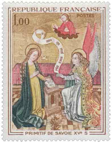 Émis en 1970, ce timbre français reproduit une Annonciation attribuée à un Primitif de Savoie de la fin du XVe siècle, conservée au musée des Beaux-Arts de Chambéry, et illustre la richesse artistique d’un territoire alors carrefour culturel entre monde français, bourguignon, flamand et italien, à une époque charnière de la civilisation occidentale ; l’œuvre originale, peinte vers 1480 sur panneau de bois et issue d’un retable d’origine inconnue, se distingue par une composition rigoureusement structurée opposant le monde céleste, symbolisé par le fond d’or, au monde terrestre figuré par la chambre de la Vierge, selon une iconographie héritée du gothique international enrichie d’un réalisme nouveau perceptible dans le traitement des étoffes et des corps ; le timbre restitue avec finesse cette organisation spatiale et symbolique, marquée par l’axe vertical de la parole angélique et par la présence de la colombe du Saint-Esprit, seul élément franchissant la frontière entre les deux sphères, tandis que la polychromie — rouges, verts, ors et bruns — traduit un langage visuel où se conjuguent amour divin, pureté, fécondité et espérance ; gravée en taille-douce par Jean Pheulpin, l’émission s’inscrit dans la série du « musée imaginaire » de la philatélie française, qui entendait rendre accessibles au grand public des œuvres majeures du patrimoine artistique national à travers l’usage postal courant, tout en soulignant l’importance historique de la Savoie comme foyer d’échanges esthétiques au XVe siècle. |