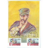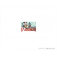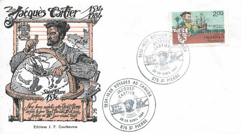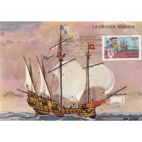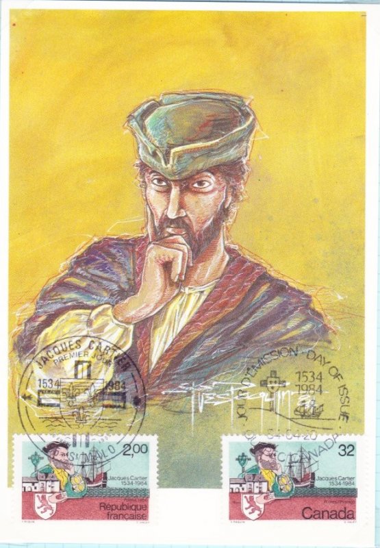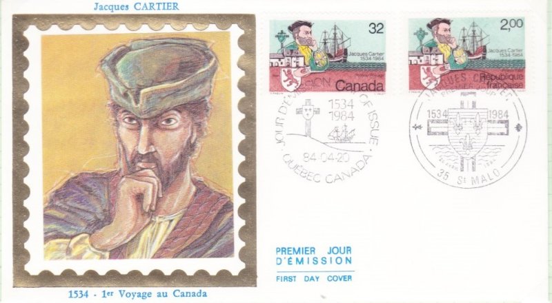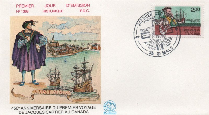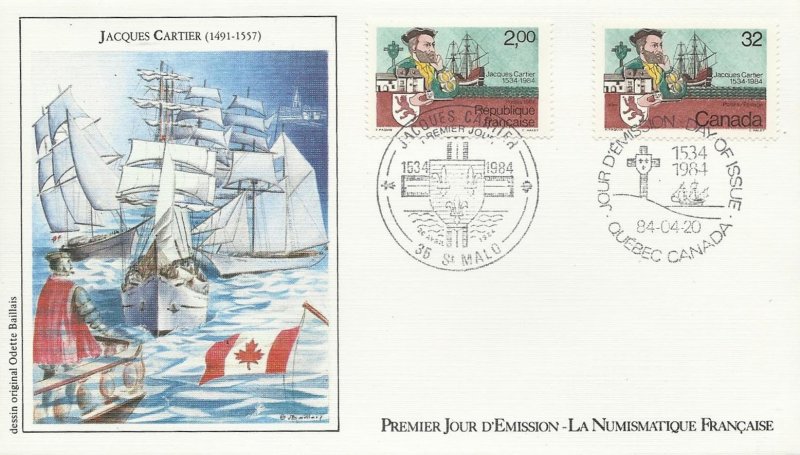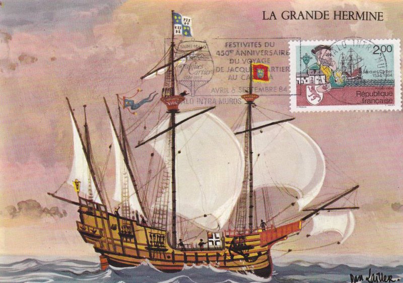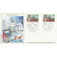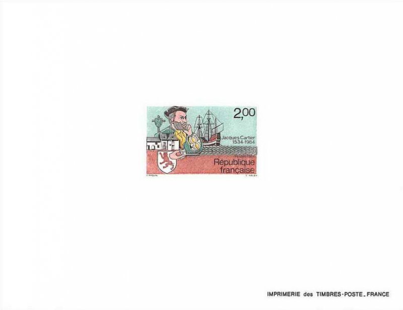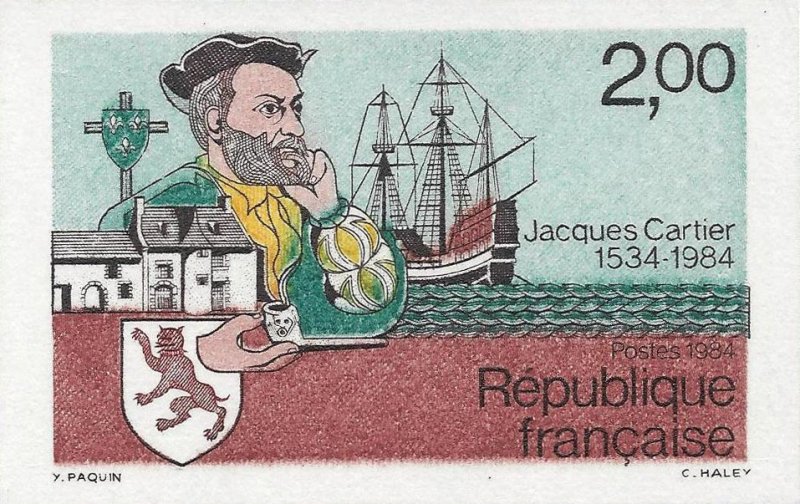 | Commentaire | Visuel - France + Canada : Jacques Cartier, un de ses deux voiliers + la croix, portant les armes anciennes de Saint-Malo à fleurs de lys (réplique de la croix dressée par le navigateur en 1534) + le "manoir de Limoëlou" (de J. Cartier) à Rothéneuf + l'écusson avec un Chien du Guet, symboles de Saint-Malo. |