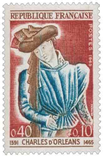 Émis en France en 1965 dans le cadre d’une série commémorative assortie d’une surtaxe au profit de la Croix-Rouge française, ce timbre rend hommage à Charles d’Orléans, figure singulière de la fin du Moyen Âge dont la destinée personnelle est indissociable de la guerre de Cent Ans et de la culture courtoise tardive, en rappelant par cette émission la place accordée par la politique postale française aux grandes figures littéraires antérieures à la Renaissance ; prince de sang marqué par une longue captivité en Angleterre après la bataille d’Azincourt, Charles d’Orléans a laissé une œuvre poétique abondante, essentiellement composée de ballades et de rondeaux, qui témoigne d’une sensibilité intime et d’un regard mélancolique sur le temps, l’exil et l’attente, thèmes que la France des années 1960 remet alors en lumière à travers une approche patrimoniale et pédagogique de son histoire littéraire ; ce timbre de France, gravé en taille-douce, s’inscrit ainsi dans une série consacrée aux écrivains et poètes français, associant commémoration culturelle et vocation solidaire, tout en participant à la diffusion d’une mémoire médiévale longtemps éclipsée par l’humanisme renaissant.