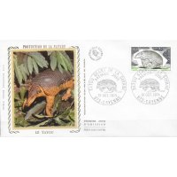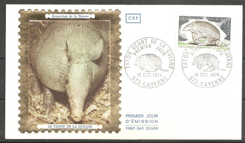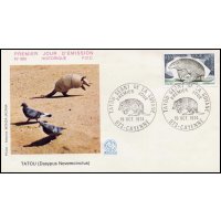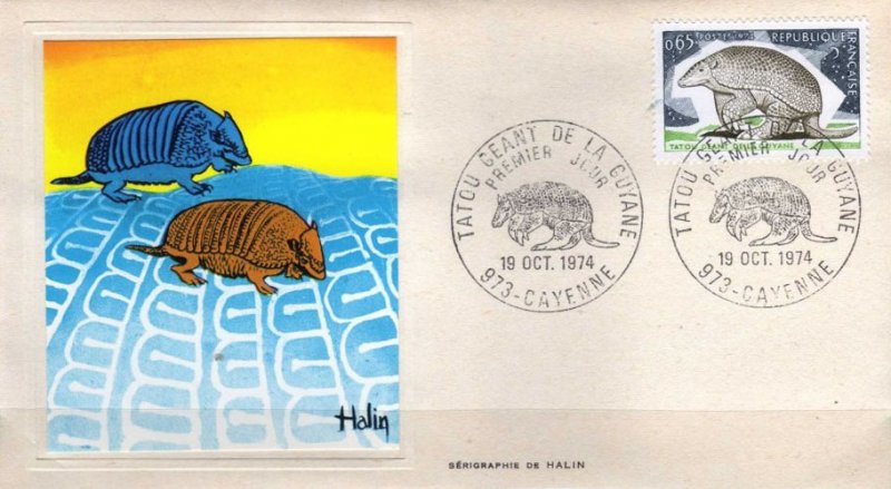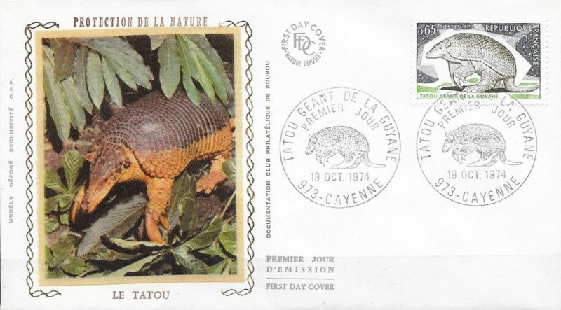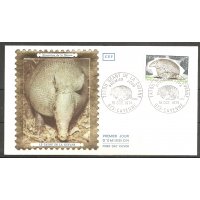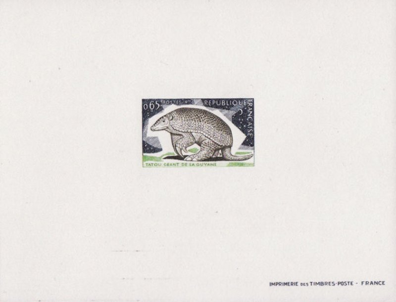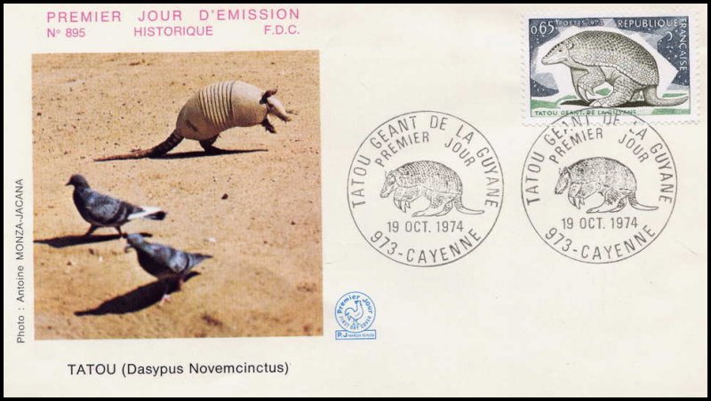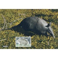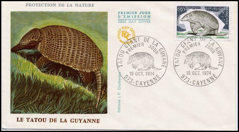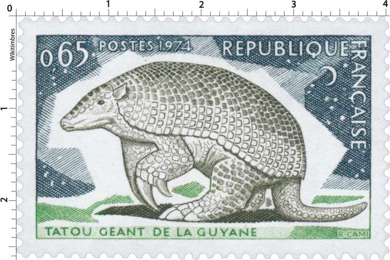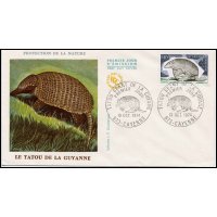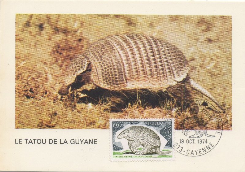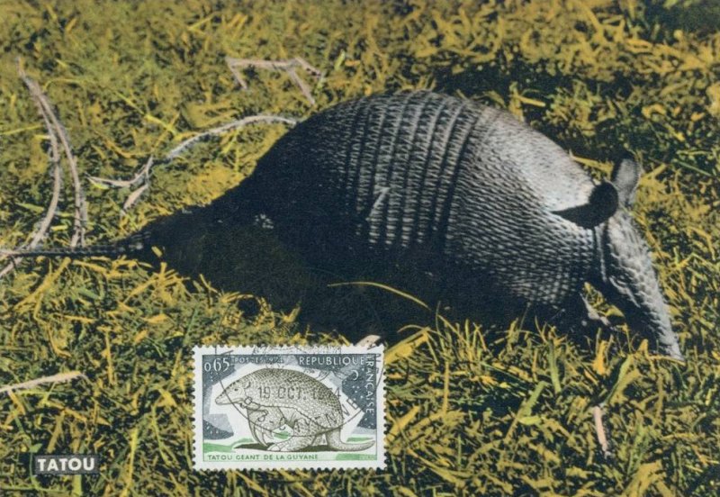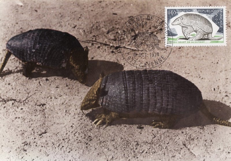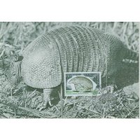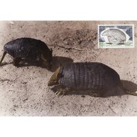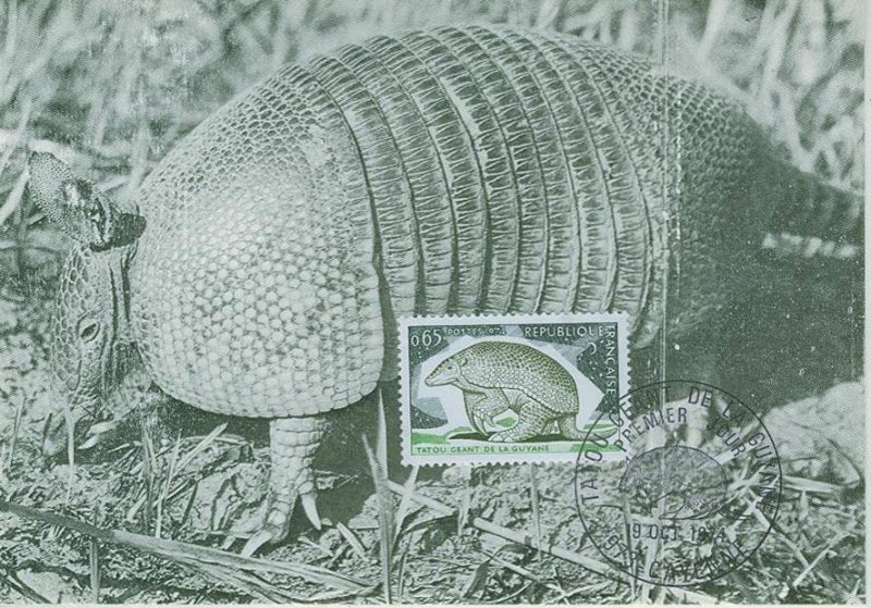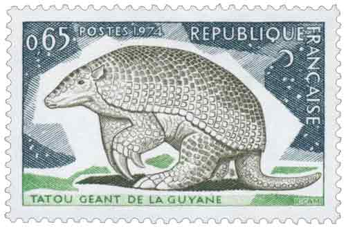 | Commentaire | Visuel : la Guyane connaît deux espèces, le "Tatou géant", pesant une cinquantaine de kilos et mesurant jusqu'à 1,50 m, et celui qui porte le sobriquet de "Cabassou", d'un gabarit légèrement inférieur. Le "cabassou" ne se dresse pas sur ses pattes de derrière, mais le "Tatou géant" est plantigrade : tous deux ont les antérieurs armés d'ongles très forts, celui du troisième doigt pouvant mesurer 20 cm. C'est dans un terrier, en lisière de forêt, que dort tout le jour ce solitaire de mœurs nocturnes, qui partage souvent son gîte avec un serpent dangereux, le "Grage grands carreaux" (Lachesis Mutus) et c'est aussi dans ce terrier, que la femelle met bas et allaite quatre vrais jumeaux à chaque portée. |