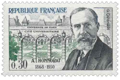 | Commentaire | Le timbre émis en 1960 à l’effigie d’André Honnorat rend hommage à une figure marquante mais discrète de la IIIᵉ République, dont l’action s’est exercée avec constance dans les domaines de l’éducation, de la santé publique et du rayonnement intellectuel français. Député puis sénateur des Basses-Alpes de 1910 à 1940, André Honnorat fut notamment ministre de l’Instruction publique et des Beaux-Arts, poste à partir duquel il développa une politique constructive et durable. Le timbre le représente devant la Cité internationale universitaire de Paris, institution qu’il contribua décisivement à fonder et à développer dès l’après-Première Guerre mondiale, conçue comme un lieu d’échanges entre étudiants de toutes nationalités et comme un instrument de paix par la connaissance mutuelle. L’œuvre politique d’André Honnorat s’illustre également par son engagement précoce contre la dépopulation, par la lutte organisée contre la tuberculose à travers le Comité national de défense qu’il présida durant de nombreuses années, et par une conception humaniste de l’action publique fondée sur la tolérance, la solidarité et la transmission du savoir. Cette figurine s’inscrit dans la série des grandes personnalités françaises et témoigne de la volonté de l’administration postale de valoriser des parcours exemplaires au service de l’intérêt général, dans un style gravé sobre et lisible, caractéristique des émissions commémoratives de la fin des années 1950 et du début des années 1960. Article rédigé pour WikiTimbres.