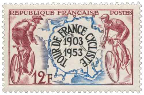 | Commentaire | Émis en France en 1953, le timbre-poste gommé commémoratif du cinquantenaire du Tour de France célèbre une épreuve devenue, depuis sa création en 1903, l’un des événements sportifs majeurs de la vie nationale et internationale, dépassant le simple cadre de la compétition pour s’inscrire durablement dans l’imaginaire collectif français ; mis en vente à Paris le 26 juillet 1953 puis dans les autres bureaux du territoire à compter du 27 juillet, ce timbre horizontal de 12 francs correspond à l’affranchissement de la carte postale pour le régime intérieur, usage postal courant qui accompagne la forte médiatisation populaire de la course ; dessiné et gravé en taille-douce par Albert Decaris, il se distingue par une composition dynamique associant la carte de France et le cycliste, synthèse graphique de l’épreuve itinérante, et par un traitement vigoureux typique de la gravure de Decaris ; l’émission rappelle l’évolution du Tour, depuis les étapes héroïques des débuts jusqu’aux innovations techniques et sportives du milieu du XXᵉ siècle, tout en soulignant la dimension humaine de l’épreuve, restée à l’échelle de l’homme malgré la modernisation des matériels et des stratégies, une caractéristique unanimement reconnue de cette compétition emblématique. |