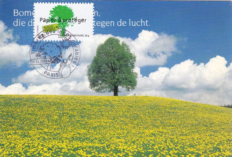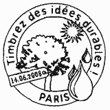 | Commentaire | La mise en vente anticipée a lieu du 14 au 22 juin au Salon du timbre, à Paris. Le cachet d'oblitération premier jour reprenant les éléments de trois des timbres : l'arbre, les gouttes d'eau et le soleil. Timbre sans millésime |