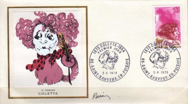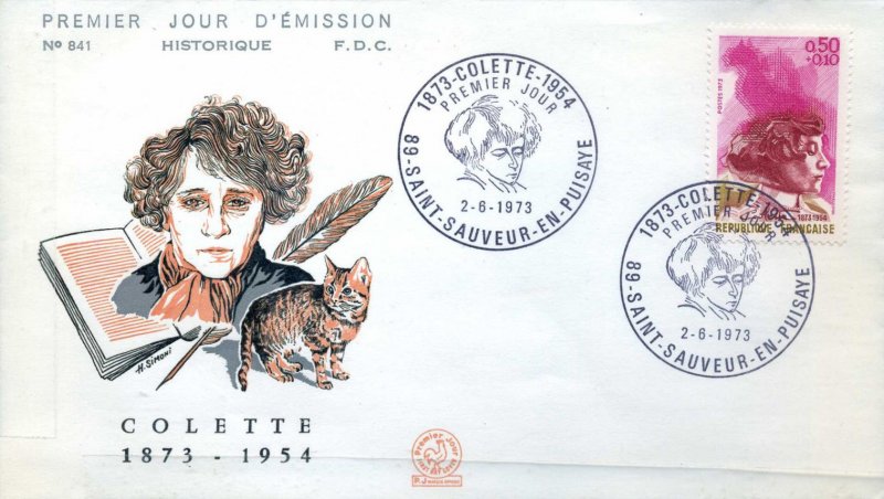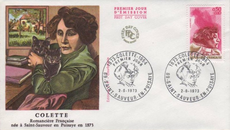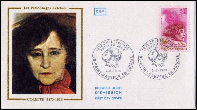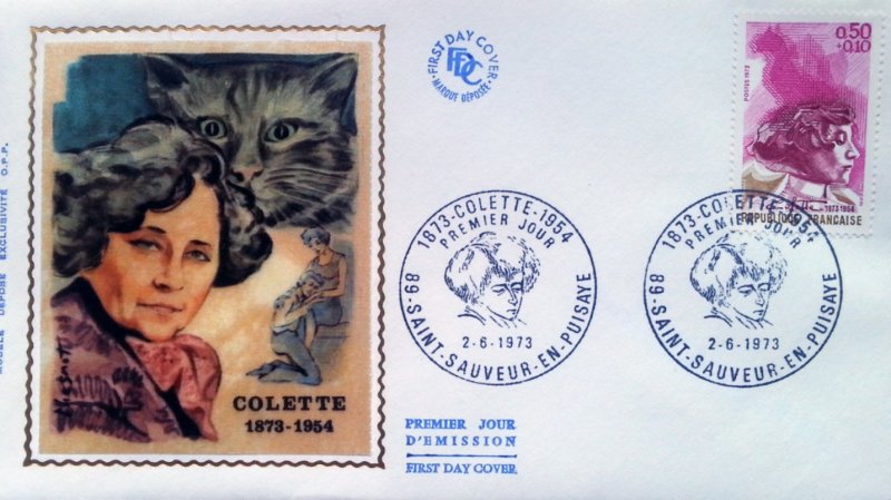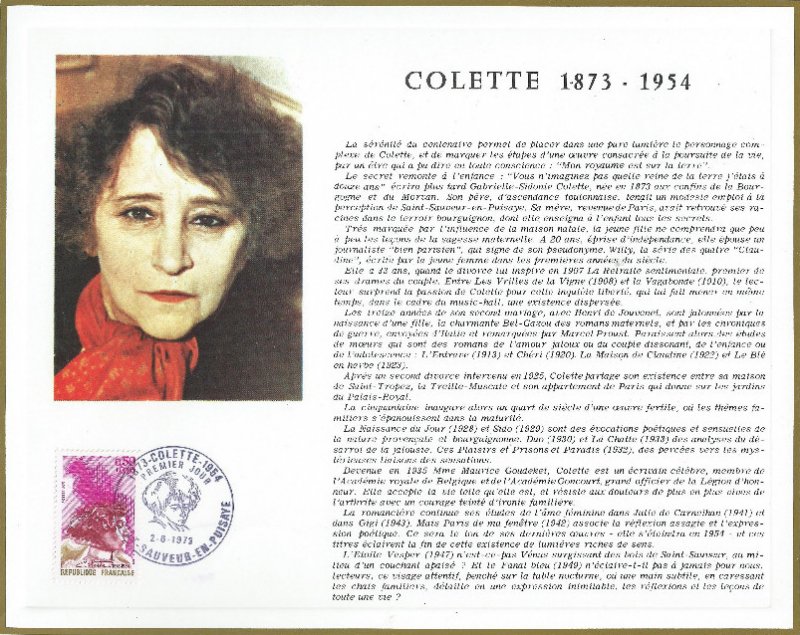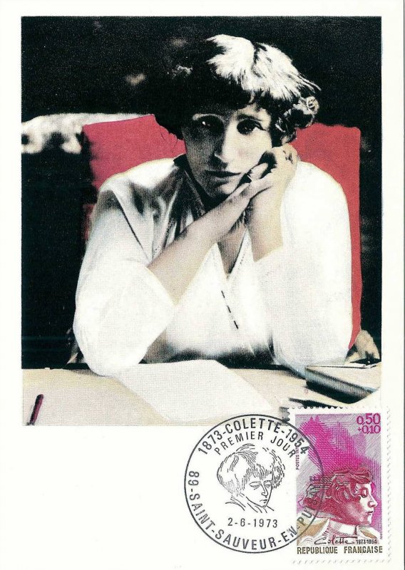 | Commentaire | Sidonie Gabrielle Colette, dite Colette, est née le 28 janv.1873 à St-Sauveur-en-Puisaye (89-Yonne), décède le 3 août 1954 à Paris. ) C'est une femme de lettres française, connue surtout comme romancière, elle fut également mime, actrice et journaliste. Colette est la deuxième femme élue membre de l’Académie Goncourt en 1945, et en devient la première femme présidente, entre 1949 et 1954. |